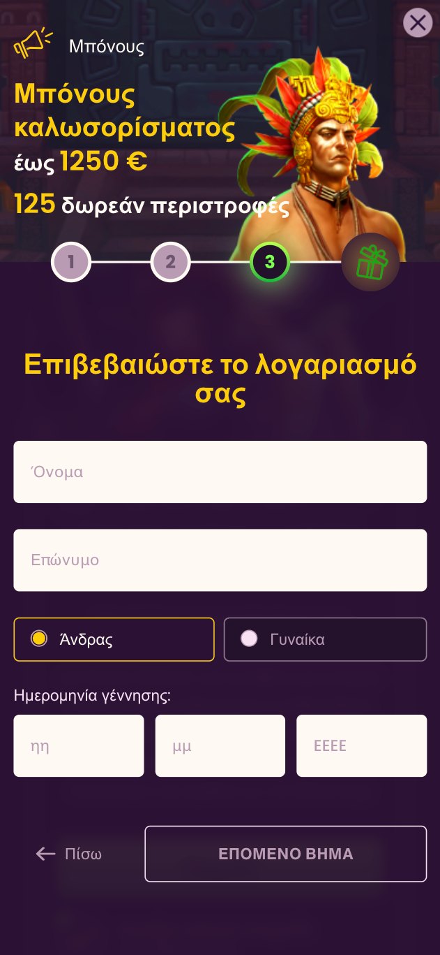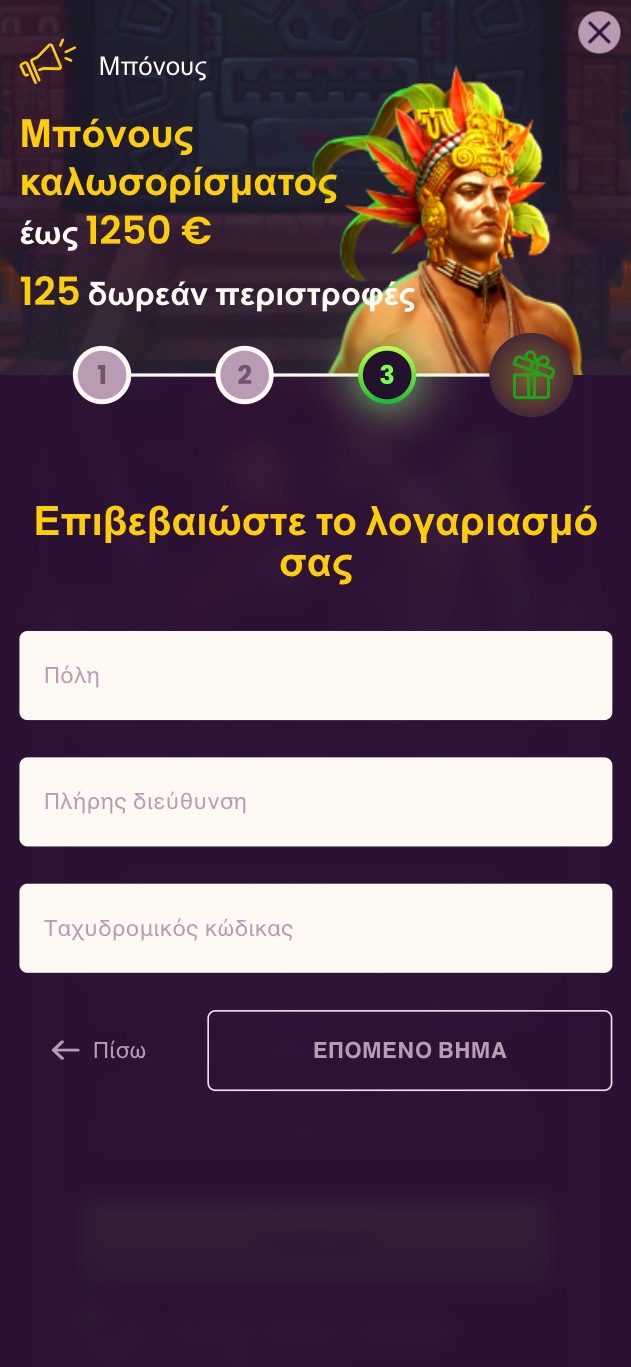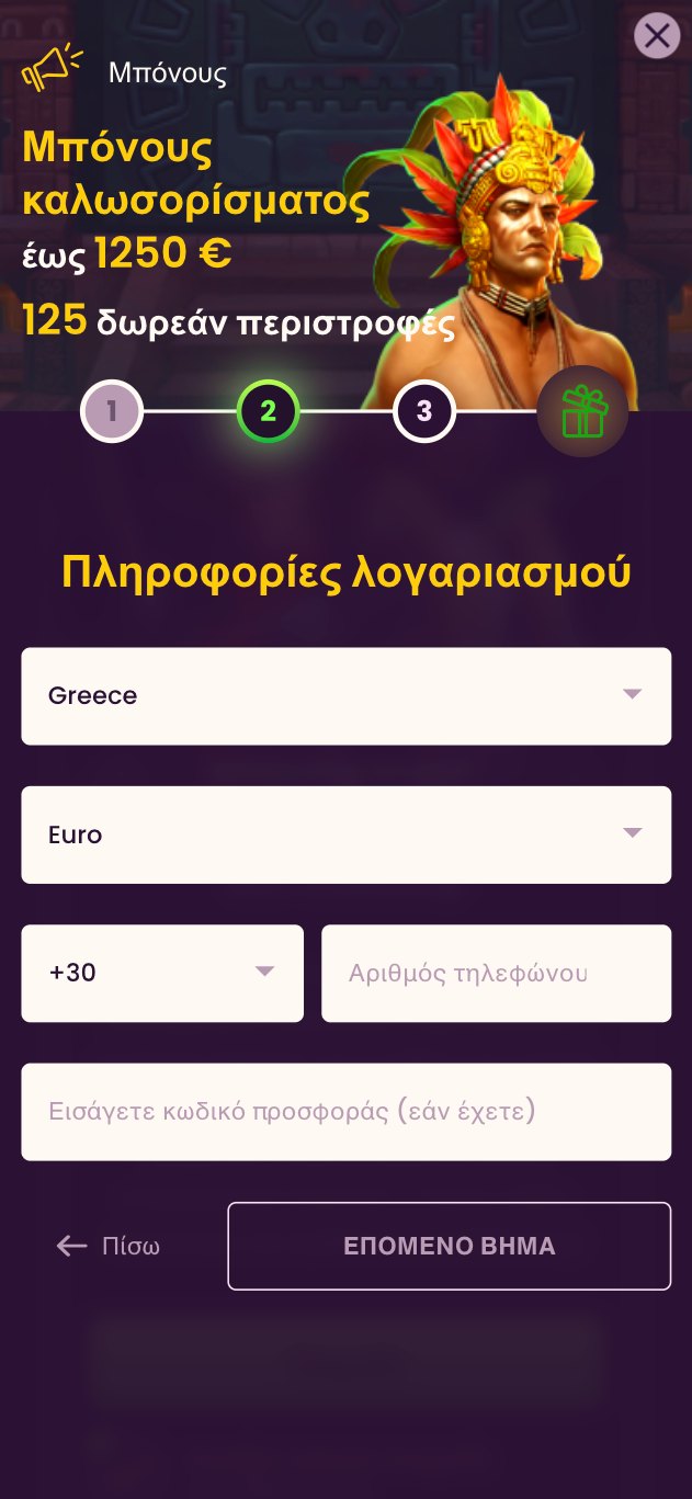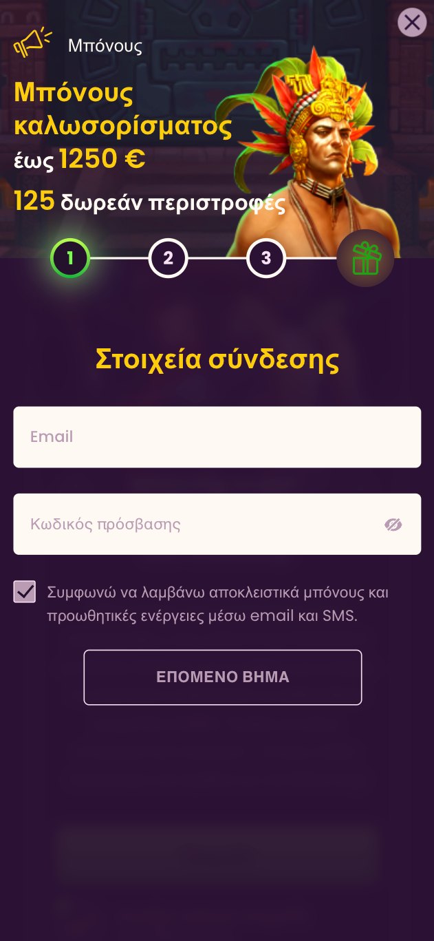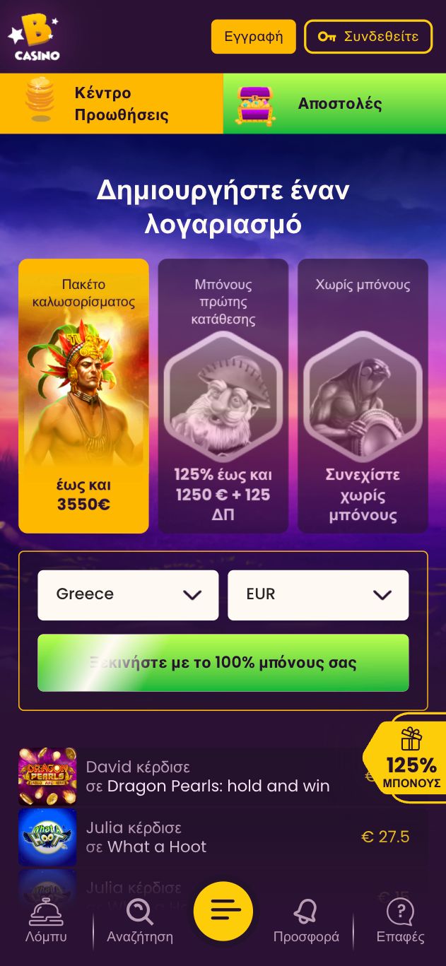 Με την πρώτη κατάθεση στο καζίνο παίρνετε μπόνους 125% έως 1.250€ και 125 δωρεάν περιστροφές. Αυτό είναι το μπόνους πρώτης κατάθεσης που ισχύει μόνο για την συναλλαγή αμέσως μετά την εγγραφή.