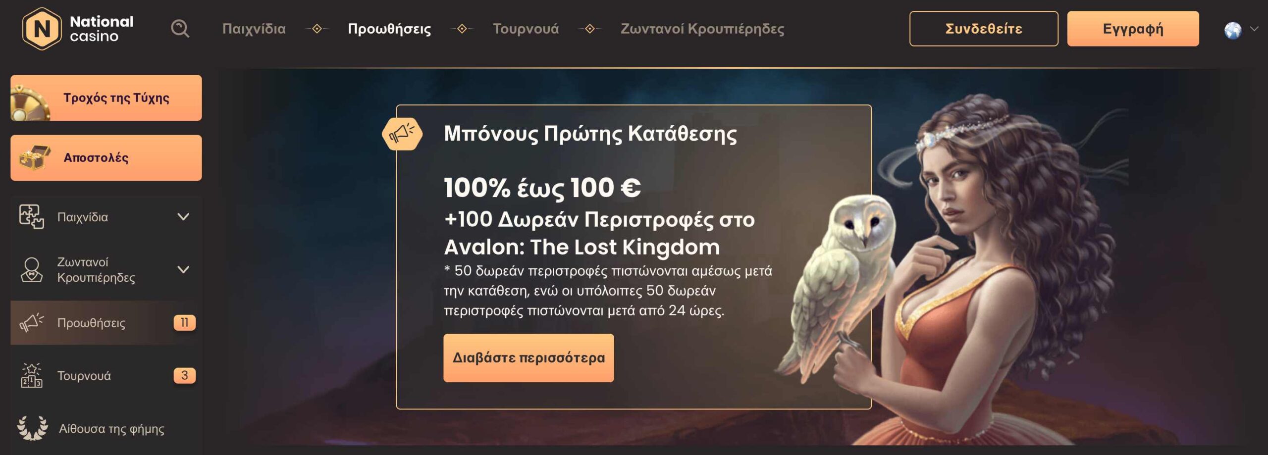 Το μπόνους πρώτης κατάθεσης στο National Casino είναι τίμιο, όμως σχετικά με τον ανταγωνισμό είναι λίγο μικρότερο. Για το καλωσόρισμα το καζίνο δίνει μπόνους 100% έως 100€ και 100 δωρεάν περιστροφές για ένα συγκεκριμένο slot, που σε αυτή τη φάση είναι για το Avalon: The lost kingdom της BGaming. Άρα με το που κάνετε εγγραφή και κάνετε και την πρώτη σας κατάθεση, θα διπλασιάσετε το ποσό σας (με μάξιμουμ μπόνους τα 100€) και θα έχετε και free spins για ένα δημοφιλές φρουτάκι.