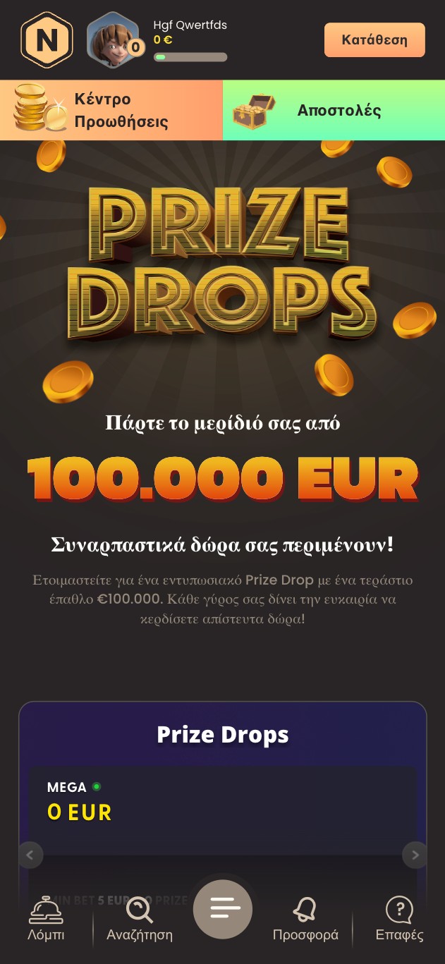 Στο καζίνο National έχετε την ευκαιρία να διεκδικήσετε μερίδιο από έπαθλα που φτάνουν έως και 100.000€! Πάρτε μέρος, ποντάρετε (με ελάχιστο τα 0.50€), κάντε περιστροφές και κερδίστε!