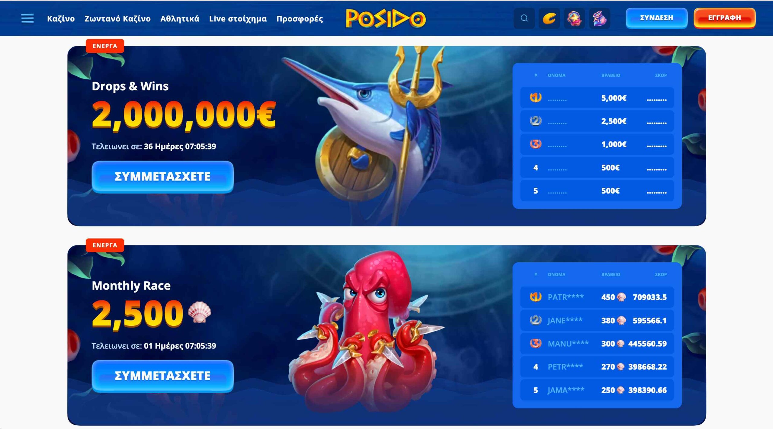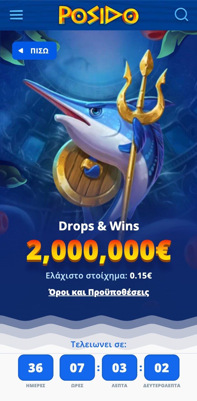 Drops and Wins, τουρνουά, διαγωνισμοί και προκλήσεις είναι προωθητικές ενέργειες που θα βρείτε σε αφθονία στο καζίνο Posido. Έπαθλα που ξεκινούν από μερικές χιλιάδες ευρώ και μπορούν να φτάσουν έως και 2.000.000€ συνολικά.