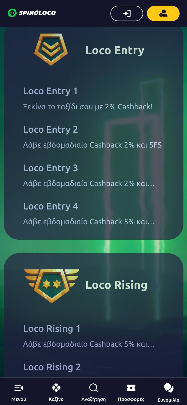 - Στο Loco Entry status, έχετε τέσσερα επίπεδα που δίνουν μπόνους για κάθε αναβάθμιση: cashback έως και 5% και έως και 15 δωρεάν περιστροφές εβδομαδιαίως