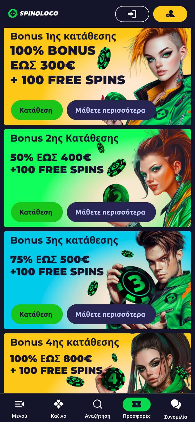 Το Spinoloco έχει ήδη κάνει μεγάλη αίσθηση στον κόσμο των διαδικτυακών καζίνο στην Ελλάδα και αυτό σε μεγάλο βαθμό οφείλεται και στο κομμάτι των προσφορών και των μπόνους, αφού μιλάμε για μια από τις πλατφόρμες με τις πιο εντυπωσιακές προωθητικές ενέργειες!
