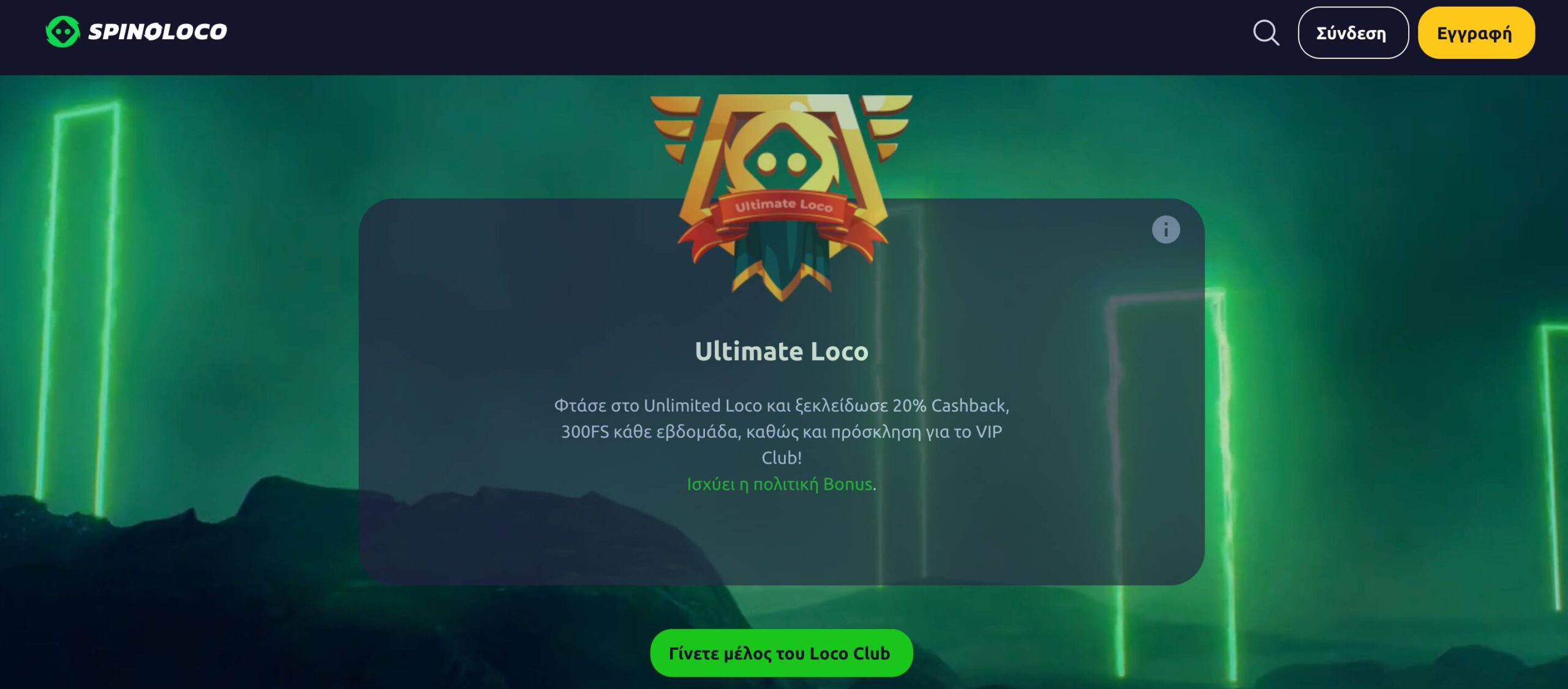 - Στο Loco Ultimate status μπαίνετε στο VIP club και έχετε 20% cashback, 300 δωρεάν περιστροφές κάθε εβδομάδα και μοναδικά μπόνους