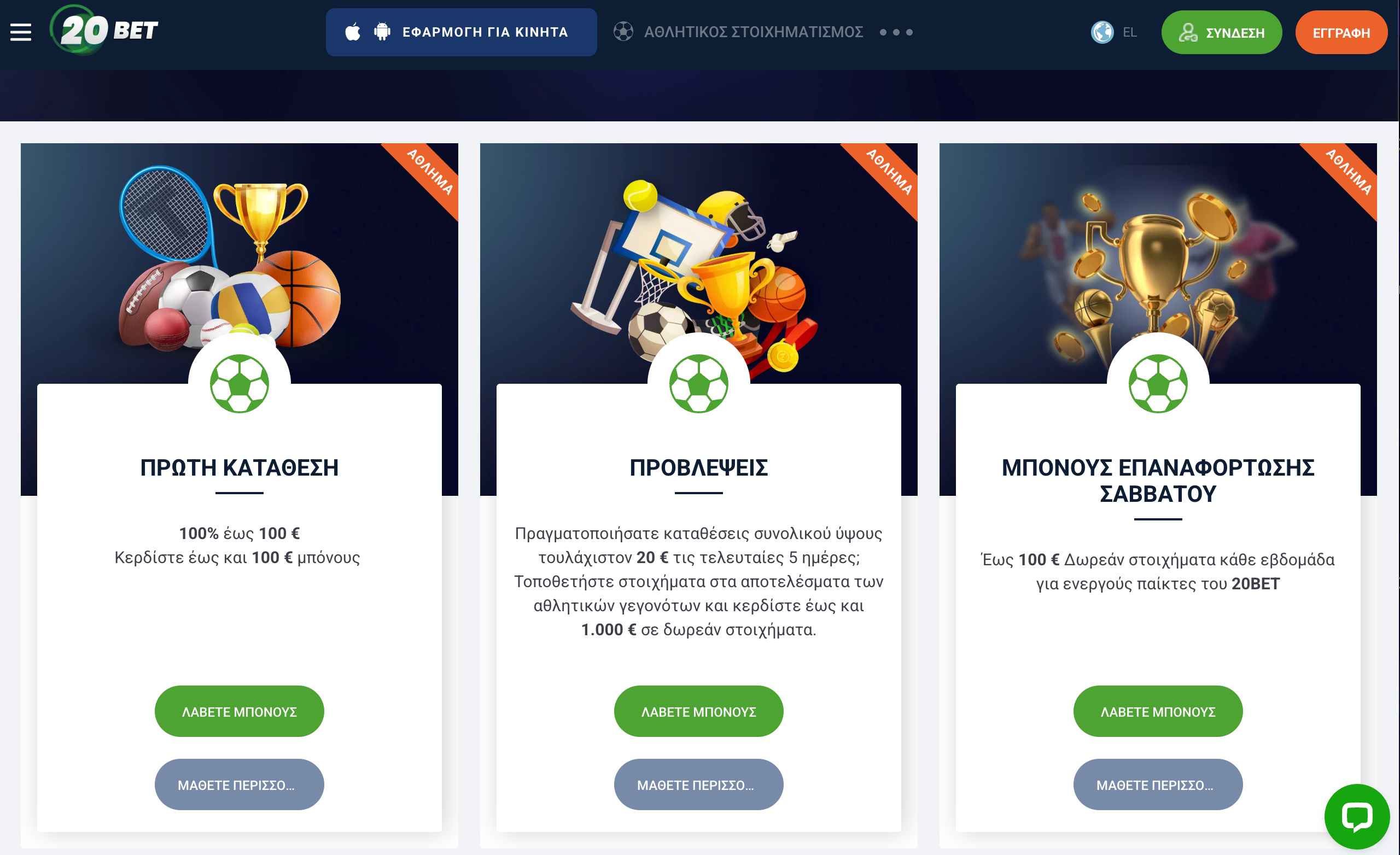 H 20bet έχει ένα πολύ καλό πακέτο με προσφορές και μπόνους για τους παίκτες που ψάχνουν για κάτι παραπάνω από μια στοιχηματική πλατφόρμα που έχει τεράστια ποικιλία αθλημάτων, χιλιάδες αγορές και πολύ καλές αποδόσεις. Οι προωθητικές ενέργειες της 20bet, την φέρνουν στο προσκήνιο και για το κομμάτι των μπόνους!