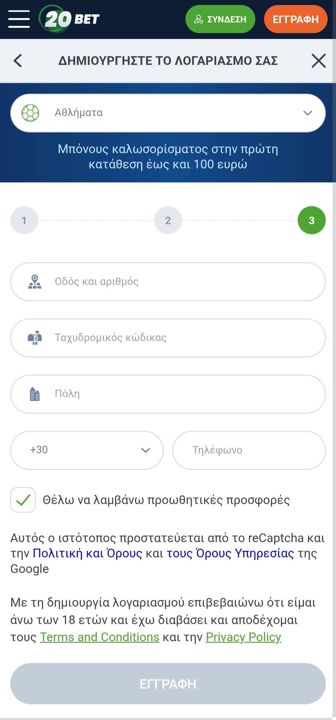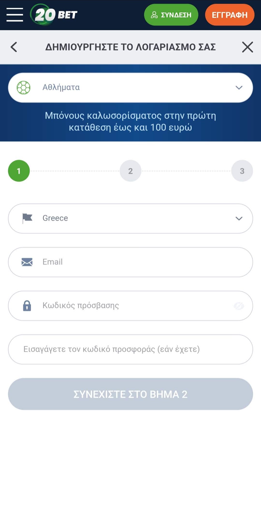 Όλες οι προσφορές της 20bet είναι διαθέσιμες για όσους έχουν λογαριασμό στην πλατφόρμα, ενώ συγκεκριμένα η προσφορά καλωσορίσματος προορίζεται για τους νέους πελάτες της στοιχηματικής εταιρίας. Αν δεν έχετε ήδη λογαριασμό στην 20bet, πρέπει πρώτα να κάνετε εγγραφή για να μπορέσετε να διεκδικήσετε τα πλούσια μπόνους. Όπως φαίνεται και παρακάτω, η εγγραφή είναι πολύ γρήγορη και πολύ εύκολη διαδικασία.