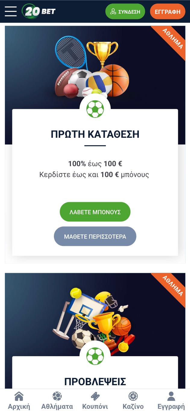 Στην 20bet μπορείτε να βρείτε διάφορες προσφορές, άλλες που είναι στάνταρ και διαθέσιμες συνεχώς και άλλες που τρέχουν σε διάφορες φάσεις και γενικά ανά τακτά διαστήματα. Αυτή την περίοδο οι προσφορές που θα βρείτε είναι: μπόνους εγγραφής, μπόνους επαναφόρτωσης, free bets, τουρνουά, boost παρολί και ένα ιδιαίτερα ενδιαφέρον πρόγραμμα ανταμοιβής.