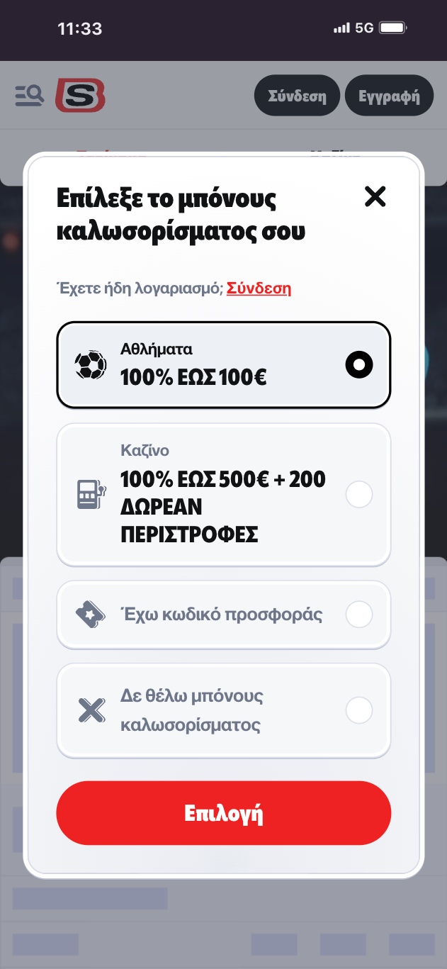 Αν κάνετε εγγραφή στη Supabet, σας περιμένει ένα μπόνους καλωσορίσματος! Στην πραγματικότητα είναι μια προσφορά για την πρώτη κατάθεση που θα κάνετε, αφού ανοίξετε λογαριασμό στην πλατφόρμα. Πολύ απλά, εγγράφεστε, κάνετε κατάθεση και η στοιχηματική σας δίνει επιπλέον 100% του ποσού της κατάθεσης, με μέγιστο μπόνους τα 100€! Ένας διπλασιασμός, δηλαδή, της αξίας, με ταβάνι τα 100 ευρώ.