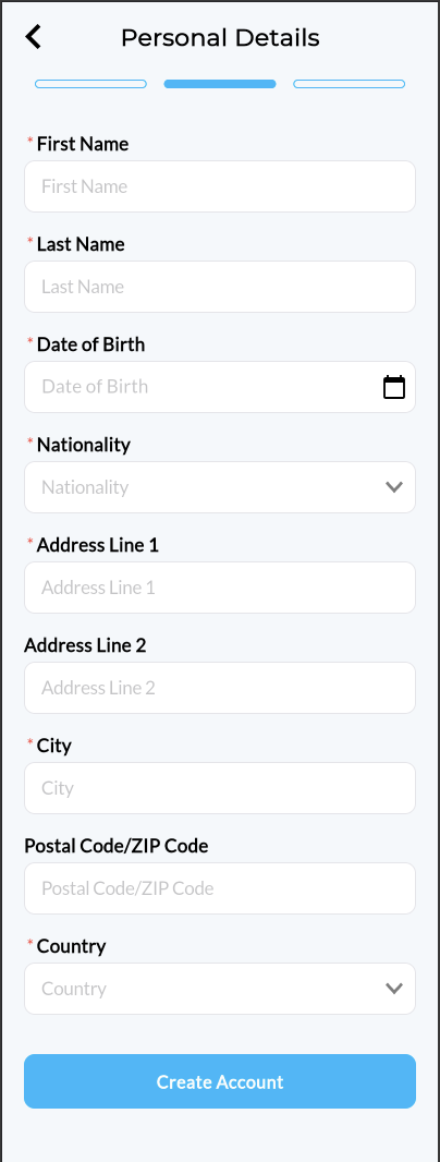 - Εισάγετε τα προσωπικά σας στοιχεία, τη διεύθυνση σας και την εθνικότητα σας και πατάτε το κουμπί “δημιουργία λογαριασμού”