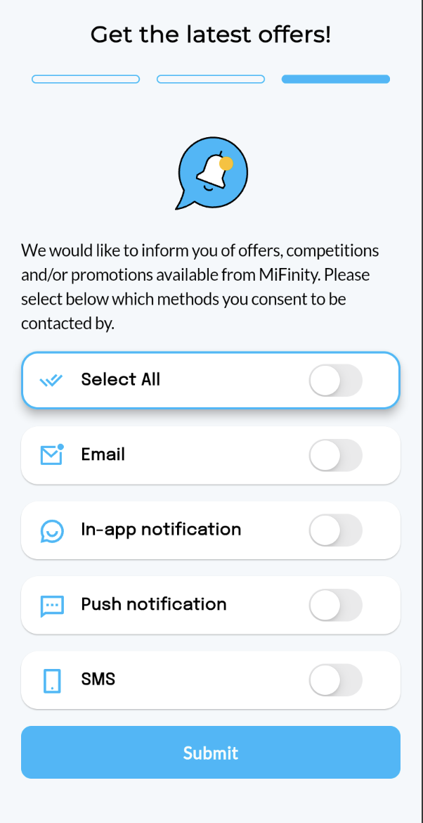 H διαδικασία που απαιτείται για να ανοίξετε λογαριασμό στο ψηφιακό πορτοφόλι MiFINITY είναι πολύ απλή. Αρχικά, πηγαίνετε στην ιστοσελίδα της MiFINITY και επιλέγετε το κουμπί για την εγγραφή. Από κει και πέρα, η δημιουργία λογαριασμού γίνεται σε τρια βήματα: