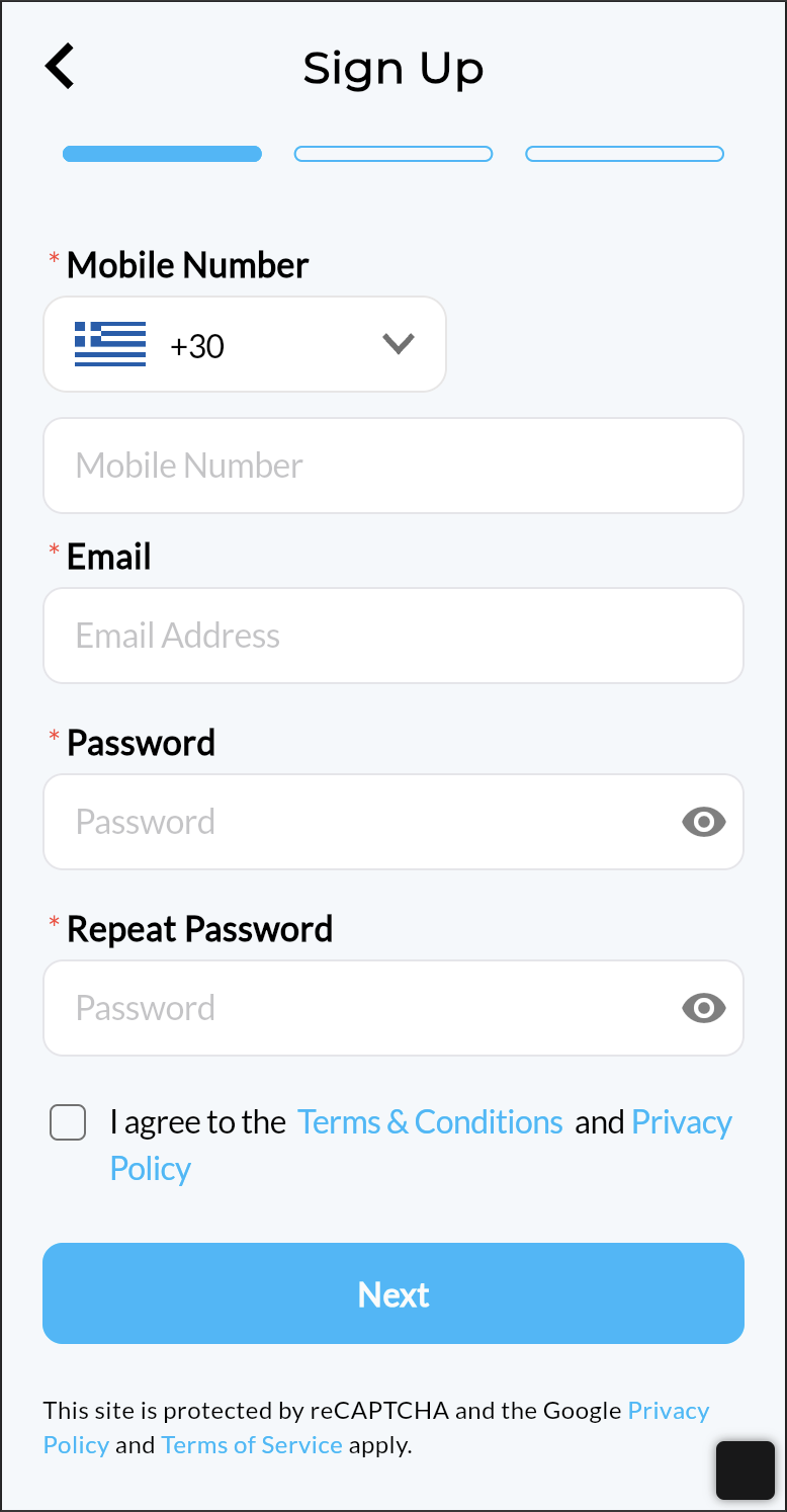 - Καταχωρείτε το τηλέφωνο σας, το email σας και δημιουργείτε έναν κωδικό πρόσβασης.