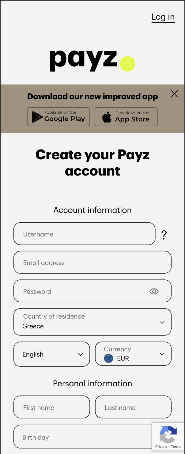 - Εισάγετε τα στοιχεία για τον λογαριασμό Payz (username, email και κωδικό πρόσβασης) και επιλέγετε τη χώρα και το νόμισμα. Σας δίνεται η επιλογή για τη γλώσσα, όμως όπως αναφέραμε και παραπάνω, τα Ελληνικά δεν είναι διαθέσιμα. Στην ίδια σελίδα, εισάγετε τα προσωπικά σας στοιχεία (όνομα, επίθετο, ημερομηνία γέννησης, διεύθυνση και τηλέφωνο) και πατάτε το κουμπί για να δημιουργήσετε τον λογαριασμό σας.