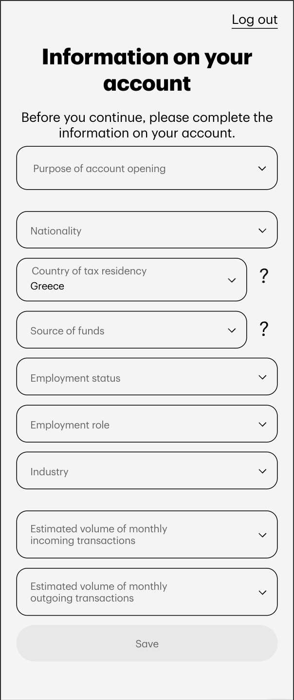 - Στην επόμενη σελίδα σας ζητείται να καταχωρήσετε περαιτέρω πληροφορίες για τον λογαριασμό σας, όπως ο λόγος που θέλετε να ανοίξετε λογαριασμό, η εθνικότητα, η πηγή των χρημάτων με τα οποία θα τροφοδοτείτε τον λογαριασμό σας, τα επαγγελματικά σας στοιχεία, καθώς και τις εκτιμώμενες μηνιαίες πληρωμές και συναλλαγές που θα πραγματοποιείτε.