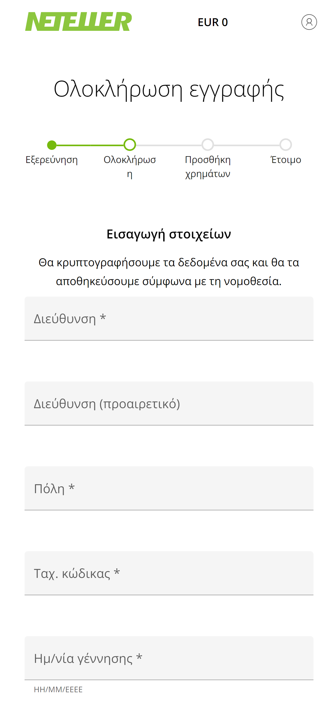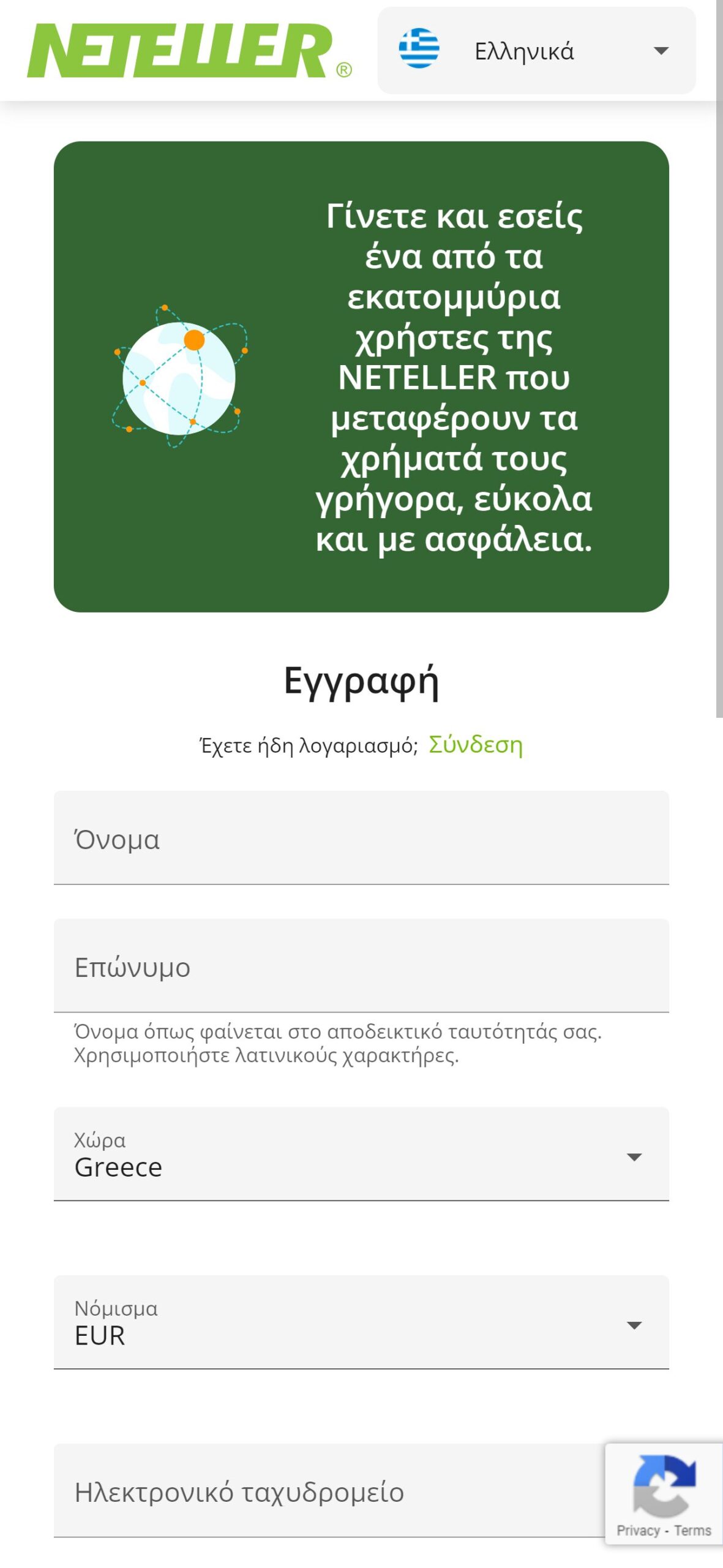 Για να εγγραφείτε, πρέπει να επισκεφθείτε τον ιστότοπο της Neteller και να επιλέξετε το κουμπί “Άνοιγμα Λογαριασμού” στην αρχική σελίδα
