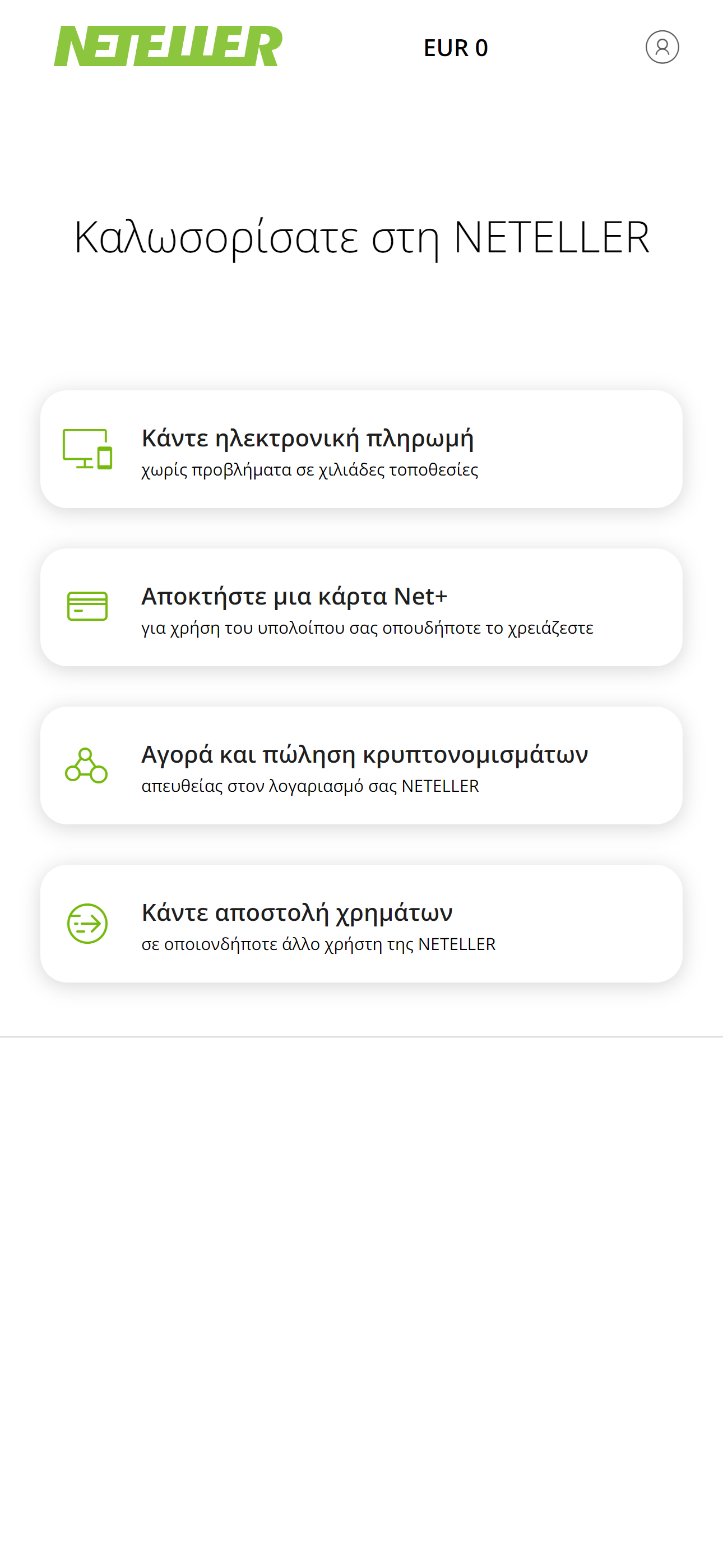 Αφού δημιουργήσετε τον λογαριασμό, είστε έτοιμοι να πραγματοποιήσετε τις συναλλαγές που επιθυμείτε, αφού βέβαια πρώτα κάνετε κατάθεση χρημάτων στο λογαριασμό Neteller.