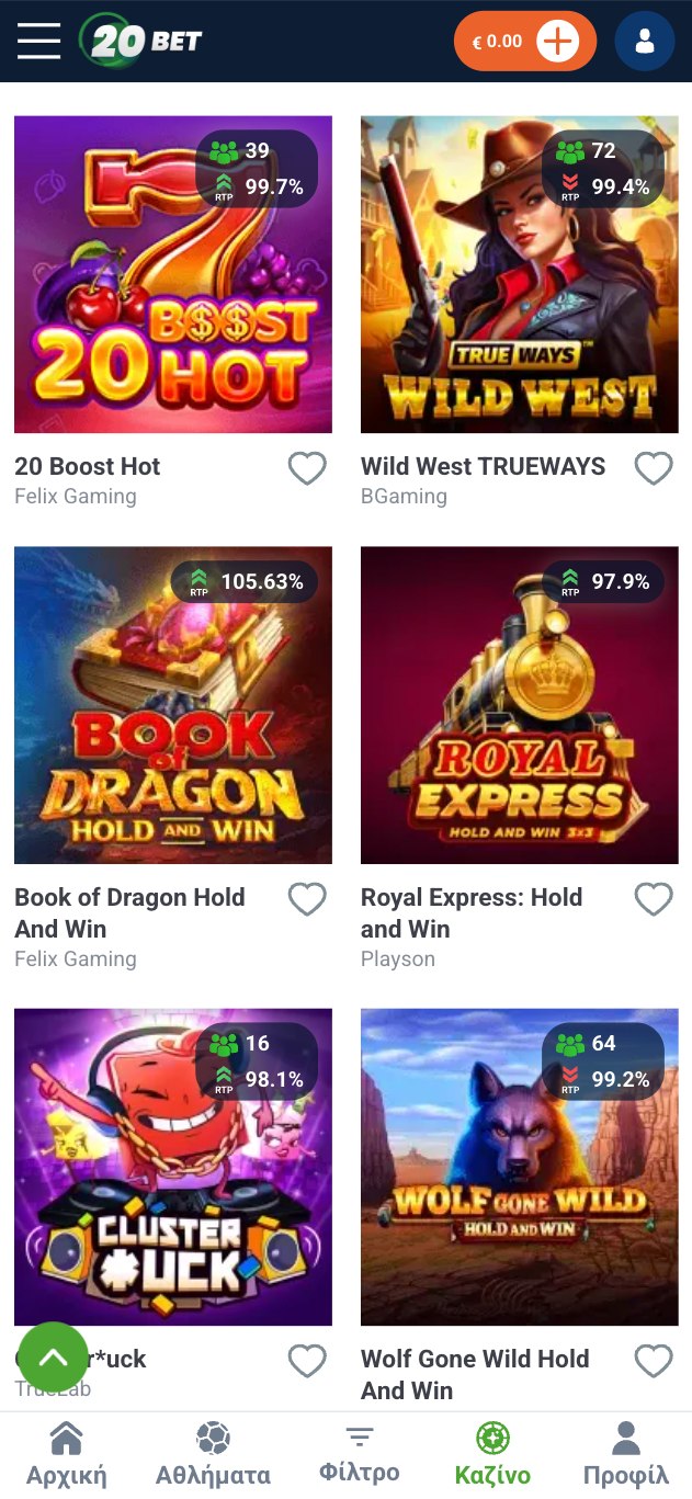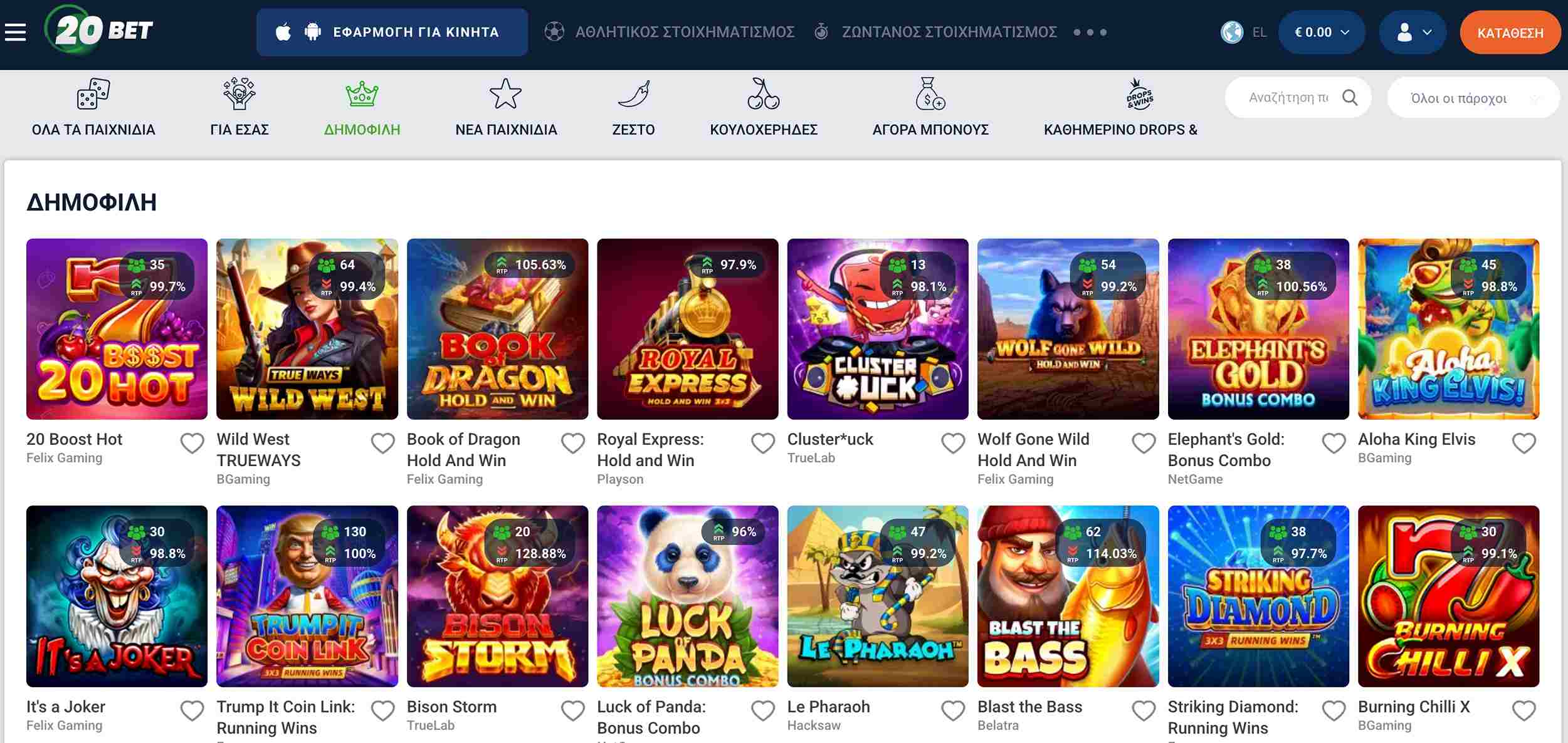 Το 20Bet φαντάζει ψηφιακός «παράδεισος» για τους λάτρεις των τυχερών παιχνιδιών με το library της πλατφόρμας να απαρτίζεται από 5.000+ τίτλους μονάχα στο κομμάτι των slots. Η ραχοκοκαλιά του καζίνο, οι κουλοχέρηδες δηλαδή, προέρχονται από περίπου 70 παρόχους λογισμικού δίνοντας στους παίκτες πρόσβαση σε κάθε είδους παιχνίδι, είτε αυτό είναι τα παραδοσιακά «φρουτάκια» είτε σύγχρονοι τίτλοι με πολλαπλούς τροχούς, 3D animations, τεράστια επίπεδα μεταβλητότητας, εξωφρενικά mechanics κ.λπ.