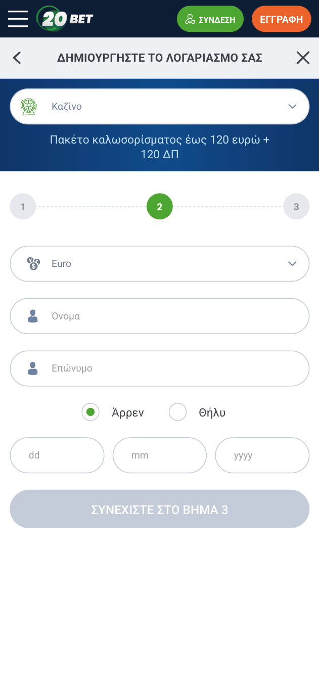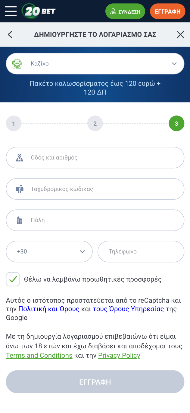 Όπως ακριβώς γίνεται και στα περισσότερα διαδικτυακά καζίνο, έτσι και εδώ η εγγραφή είναι απλή και γρήγορη. Πατάτε το κουμπί «Εγγραφή» και συμπληρώνετε email και κωδικό πρόσβασης. Συνιστούμε να πληκτρολογήσετε με προσοχή αυτά τα δύο καθώς θα τα χρησιμοποιείται μελλοντικά κάθε φορά που θέλετε να συνδεθείτε στον λογαριασμό σας. Στο επόμενο στάδιο θα σας ζητηθούν ο αριθμός τηλεφώνου, το πλήρες ονοματεπώνυμο, διεύθυνση κατοικίας και η ημερομηνία γεννήσεως σας.