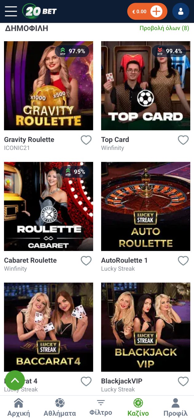 Επειδή όμως τα slots δεν είναι για όλους το 20Bet παρέχει και μια γκάμα από 500+ instant games που περιέχει τα περισσότερα γνωστά plinko, dice, scratch cards, keno, mines, penalties και crash τίτλους όπως τα Aviator της Spribe και το Big Bass Crash της Pragmatic. Αναφορά αξίζει να γίνει και στο τελευταίο trend της αγοράς, το Chicken Road με τους τεράστιους πολλαπλασιαστές κέρδους. Το κερασάκι στην τούρτα έρχεται να βάλει η μεγάλη ποικιλία από παραδοσιακά table games και οι δεκάδες εκδόσεις video poker!