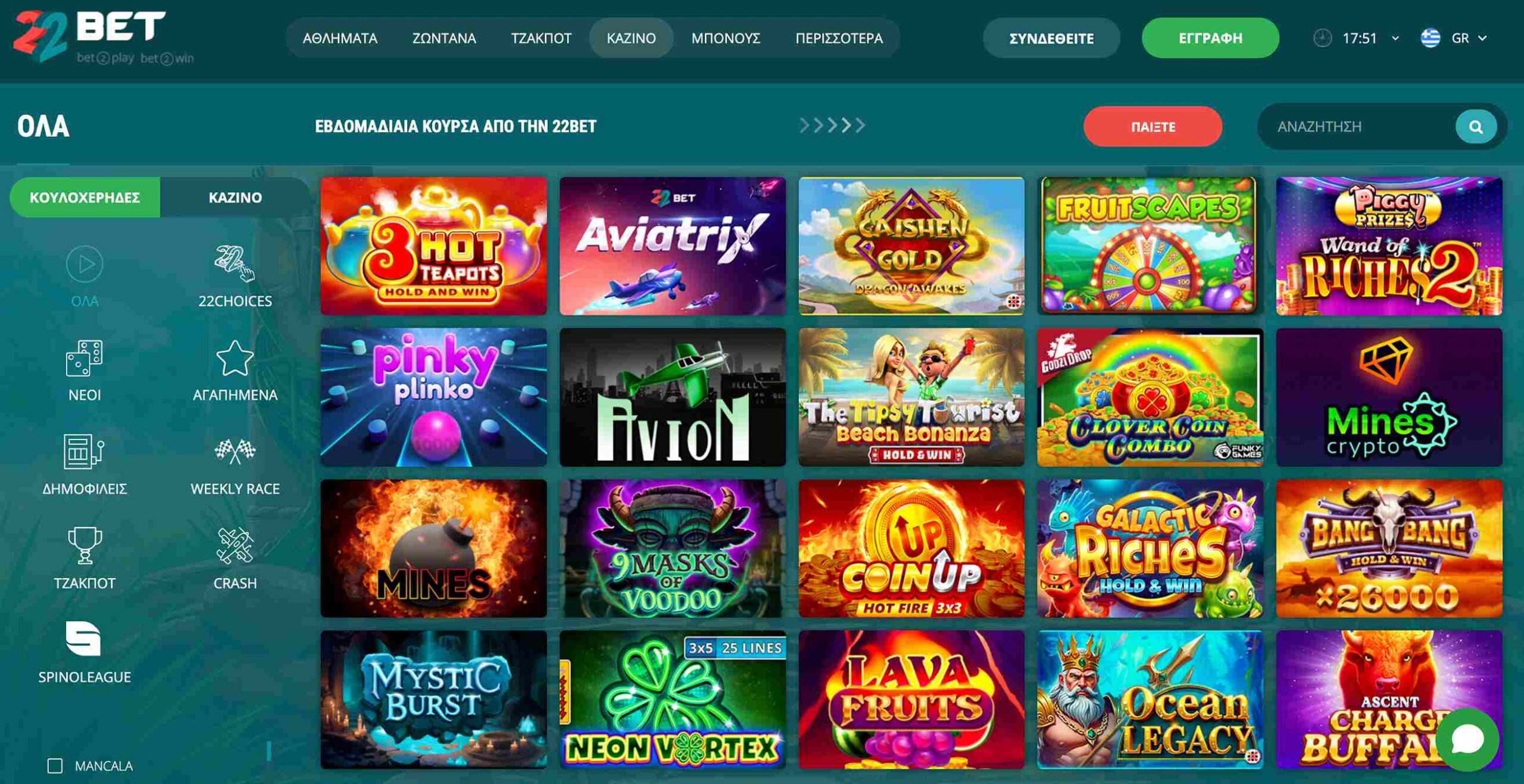 Με χιλιάδες παιχνίδια και εκατοντάδες επιλογές σε live τραπέζια αποτελεί απαραίτητο σταθμό για κάθε παίκτη που αναζητά κορυφαίες καζινικές εμπειρίες. Στην συνέχεια θα δούμε αναλυτικά όλα αυτά που έχει να προσφέρει το 22Bet casino σε σημείο που θα μπορείτε από μόνοι σας να καταλάβετε γιατί όντως αξίζει μία δοκιμή!