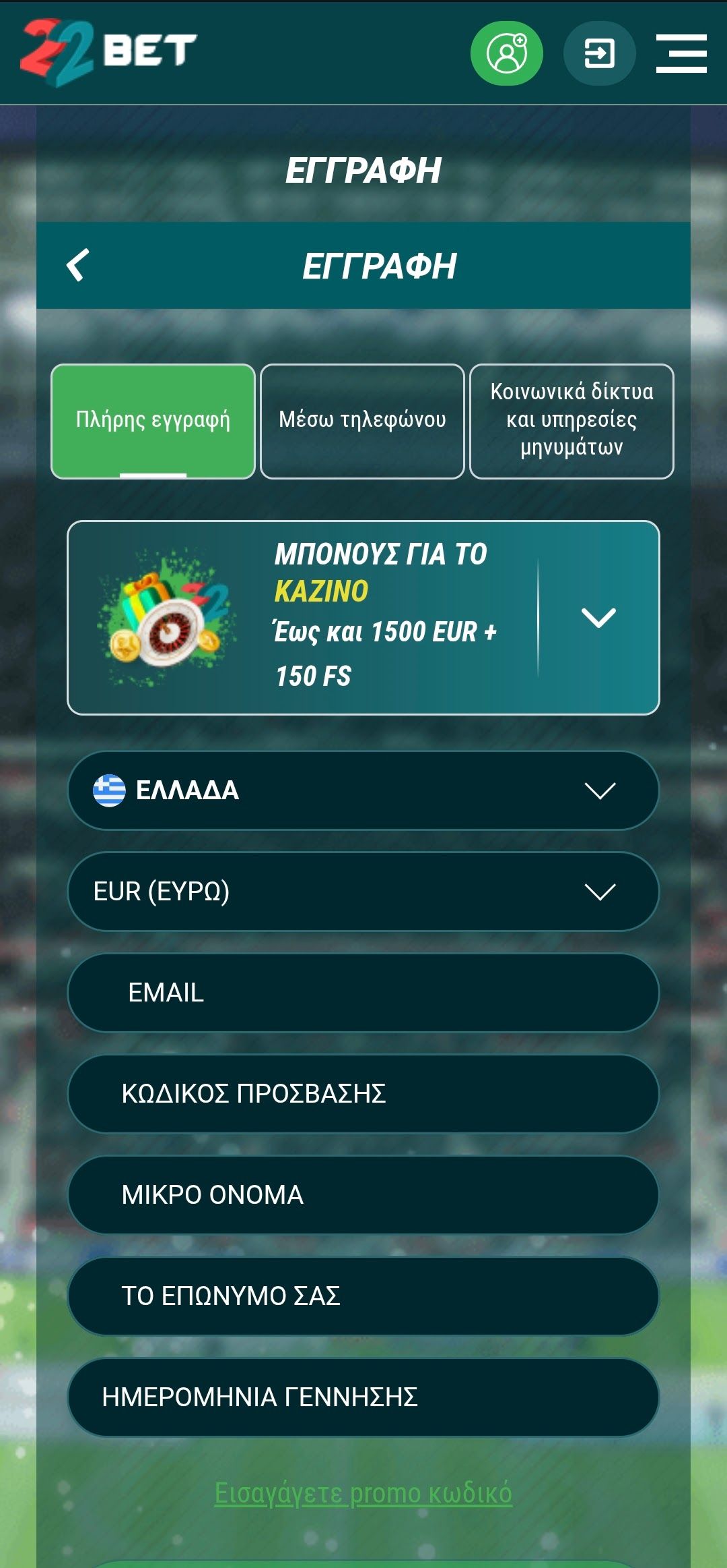 Η εγγραφή στο καζίνο της 22Bet ολοκληρώνεται μέσα σε 2-3 λεπτά. Αρκεί να κάνετε κλικ στο κουμπί εγγραφής και να συμπληρώσετε το email και τον κωδικό πρόσβασης τα οποία θα χρησιμοποιείται μελλοντικά για να συνδέεστε στον λογαριασμό σας. Έπειτα θα σας ζητηθούν ορισμένα προσωπικά στοιχεία όπως το πλήρες ονοματεπώνυμο, ο τηλεφωνικός αριθμός και η διεύθυνση κατοικίας σας. Τέλος, αφού αποδεχτείτε τους όρους χρήσης και την πολιτική απορρήτου της πλατφόρμας τότε είστε έτοιμοι να ξεκινήσετε το παιχνίδι.