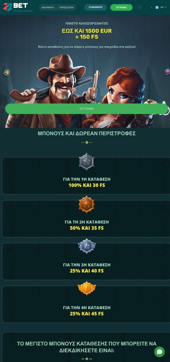 Για τους νέους παίκτες του 22Bet Casino διαθέσιμη είναι μια πολύ ελκυστική προσφορά καλωσορίσματος που περιλαμβάνει ένα μπόνους έως 1.500€ και 150 δωρεάν περιστροφές. Το μπόνους αυτό μπορείτε να το πάρετε στις πρώτες τέσσερις καταθέσεις που θα κάνετε!