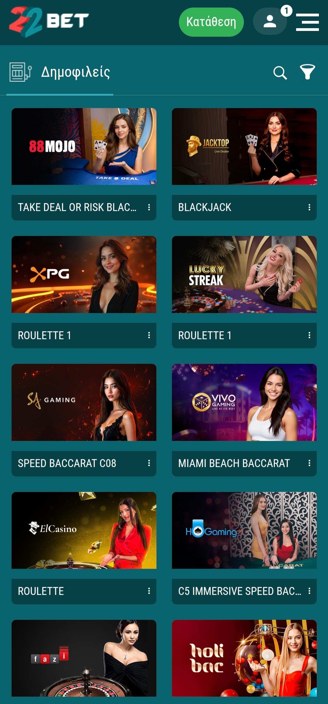 Το live casino του 22bet μπορεί αρχικά να μην γεμίζει το μάτι όμως αυτό που οι περισσότεροι δεν παρατηρούν είναι πως υπάρχουν τίτλοι από 19 παρόχους. Αν και απουσιάζουν κάποια μεγάλα ονόματα, ξεχωρίζουν ορισμένοι providers όπως Vivo Gaming, Lucky Streak και Fazi.