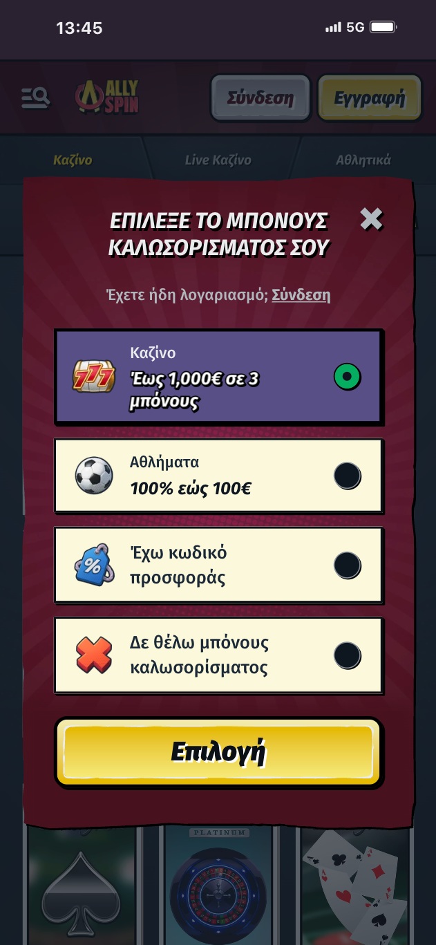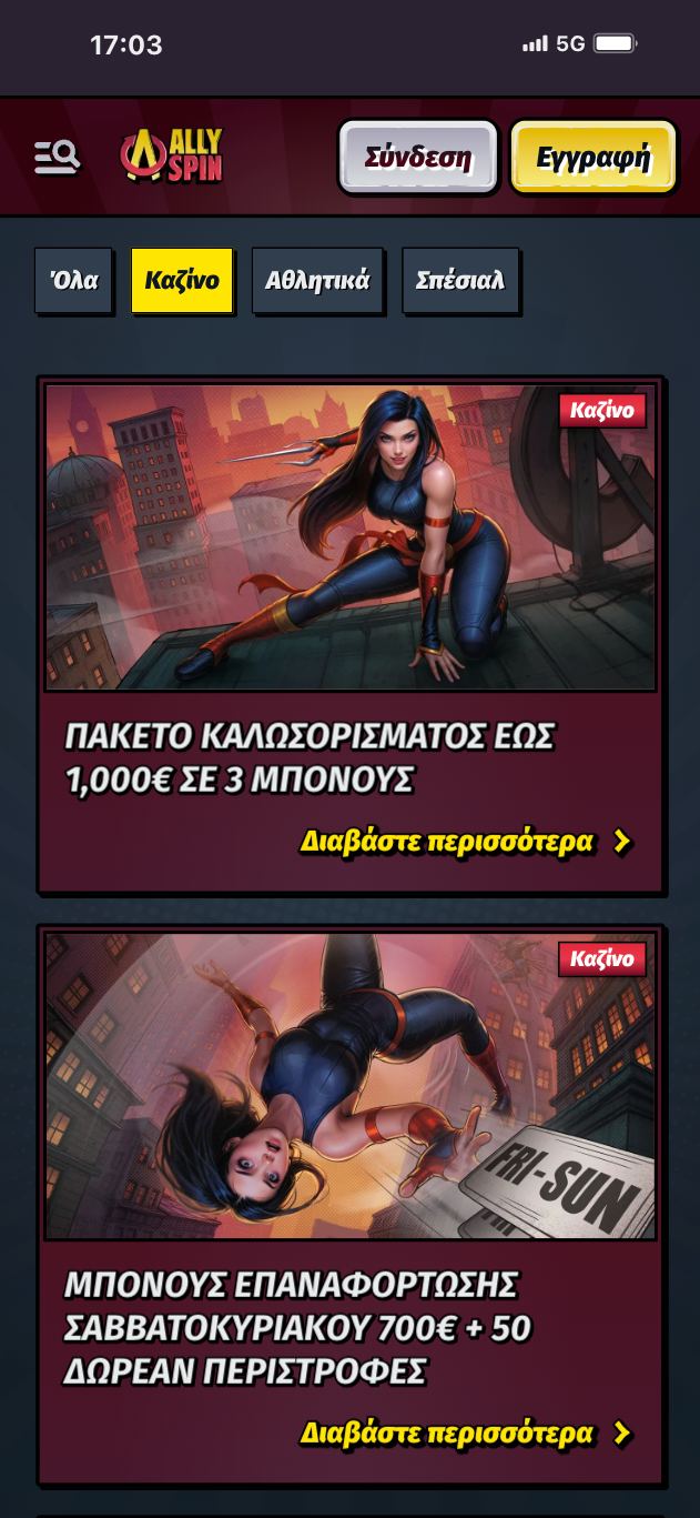 Το καζίνο Allyspin της NovaForge Ltd είναι διαθέσιμο και για τους παίκτες στην Ελλάδα! Αν θέλετε να μάθετε τα πάντα γύρω από τις προσφορές και τα μπόνους, τις πληρωμές, τα παιχνίδια και τους παρόχους, την εξυπηρέτηση πελατών, το live casino αλλά και την εμπειρία παιχνιδιού από το κινητό, απλώς διαβάστε την πιο ολοκληρωμένη παρουσίαση και κριτική παρακάτω!