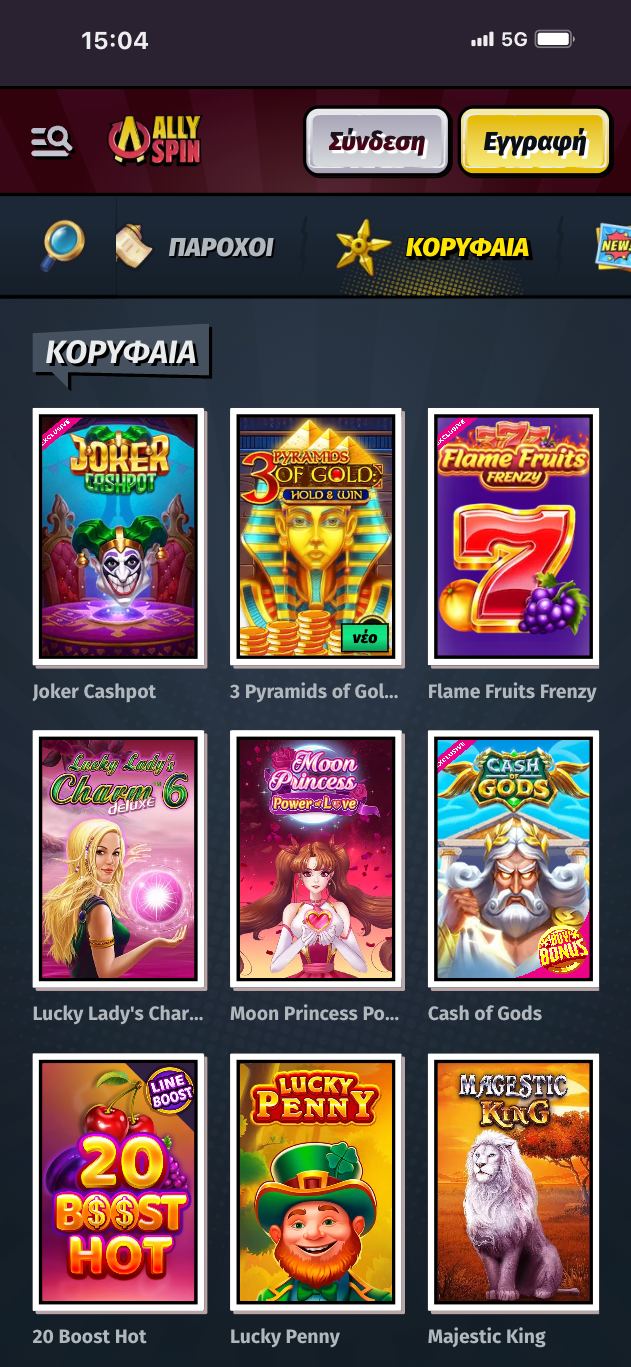 🎰 Κουλοχέρηδες: το ότι στα διαδικτυακά καζίνο μπορείτε να βρείτε κυριολεκτικά χιλιάδες διαφορετικούς κουλοχέρηδες είναι ένα από τα πιο εντυπωσιακά πράγματα στο οnline gaming, όμως πολλές φορές δε φτάνει αυτό. Η ποικιλία μπορεί να είναι τεράστια, πρέπει να υπάρχει όμως και ένα επίπεδο στα παιχνίδια τόσο από άποψη ποιότητας, υψηλού RTP, μεταβλητότητας κλπ. Στο Allyspin μπορείτε να παίξετε πάνω από 8.000 διαφορετικά φρουτάκια όλων των ειδών και παραλλαγών και μάλιστα από παρόχους που εγγυώνται την ποιότητα. Πέντε από τα δημοφιλέστερα slots στο Allyspin είναι: