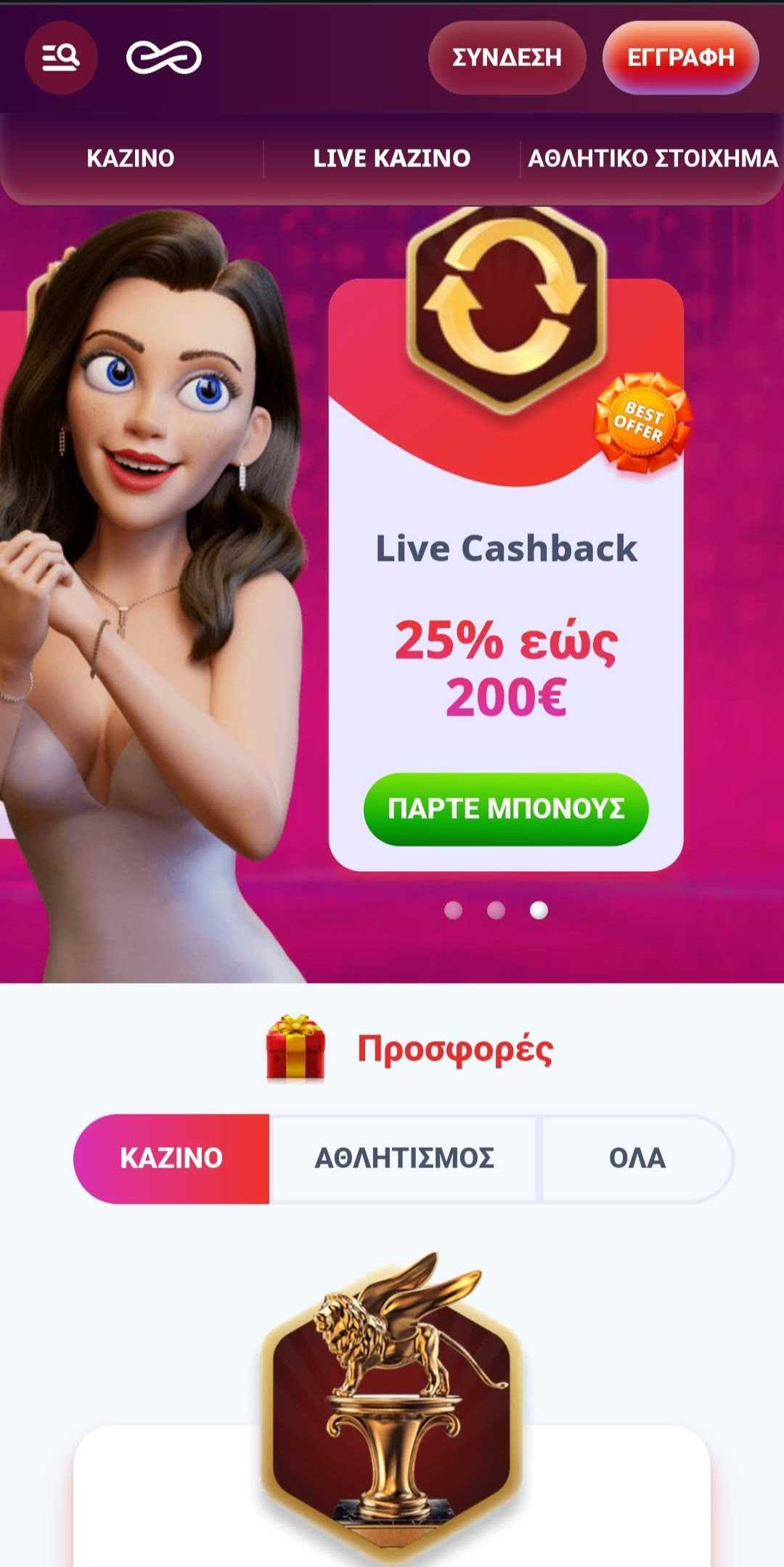 Μέσα σε 48 ώρες από την πρώτη κατάθεση, δικαιούστε 10% επιστροφή των απωλειών σας – με ελάχιστο ποσό τα 5€ και μέγιστο τα 200€. Η προσφορά ισχύει και για τα live παιχνίδια καζίνο!