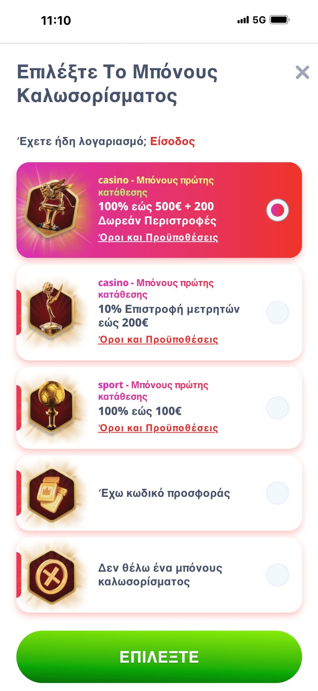 Καταρχάς, με το καλημέρα σας, το καζίνο έχει δύο επιλογές για τους νέους χρήστες της πλατφόρμας όσον αφορά στο μπόνους καλωσορίσματος.