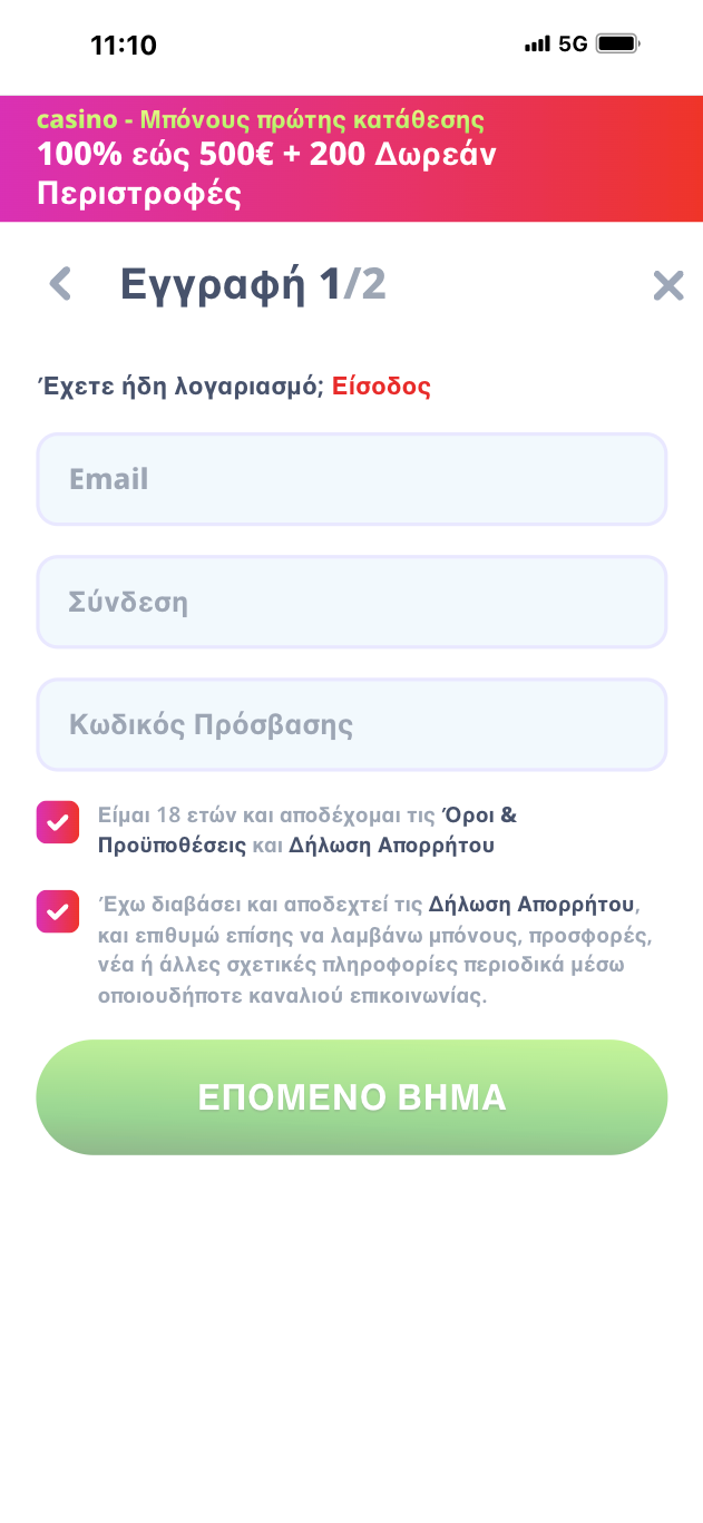 Βήμα 2: Ορίστε διεύθυνση ηλεκτρονικού ταχυδρομείου, username και κωδικό πρόσβασης. Επιβεβαιώστε την ηλικία σας και συναινέστε στους όρους και τις προϋποθέσεις του Casino Infinity καθώς και στην πολιτική απορρήτου.