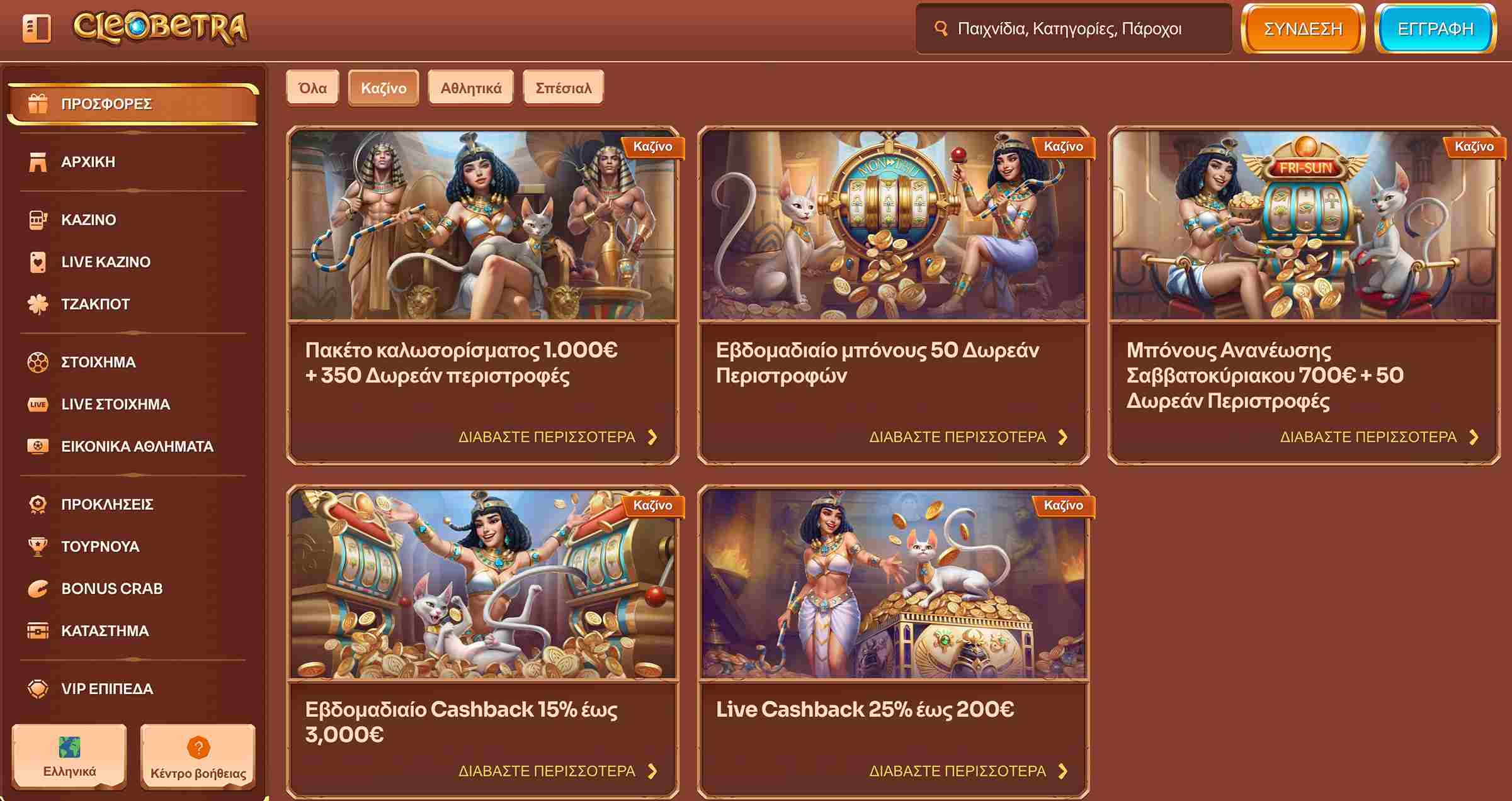 Το καζίνο Cleobetra αποτελεί μία από τις πιο πρόσφατες αφίξεις στον χώρο του online gambling, έχει όμως ήδη κάνει αισθητή την παρουσία του. Με βάση την αιγυπτιακή θεματολογία και μια καλοσχεδιασμένη πλατφόρμα, δίνοντας ιδιαίτερη έμφαση στην ποικιλία αλλά και την ποιότητα των παιχνιδιών, προσφέρει μια ιδανική εμπειρία τόσο για νέους όσο και έμπειρους παίκτες.