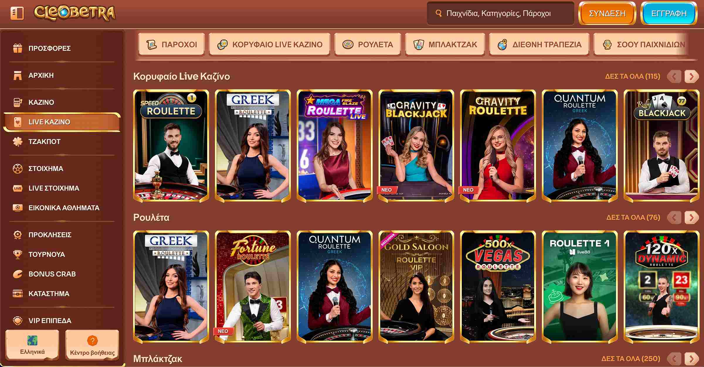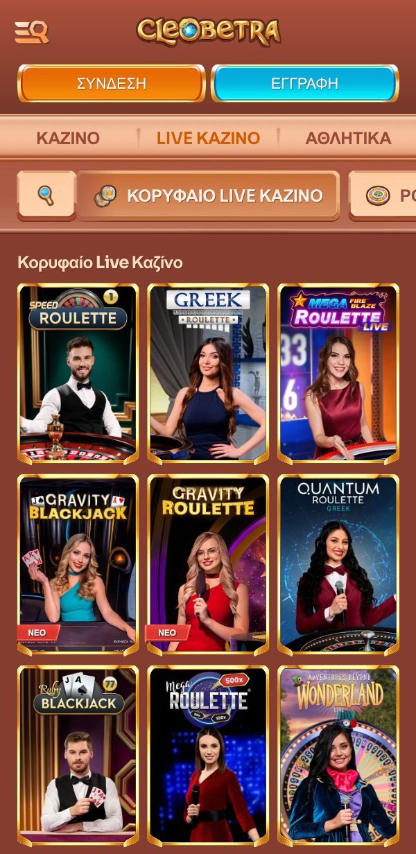 Για όσους ενδιαφέρονται για το πιο «ζωντανό» παιχνίδι, το live casino περιέχει 360+ τραπέζια με δεκάδες παραλλαγές γνωστών παιχνιδιών, πολλά game shows και διεθνή τίτλους, χωρισμένα φυσικά σε πολλές κατηγορίες επιπέδων πονταρίσματος. Εδώ καλό είναι να αναφέρουμε πως στο Cleobetra καζίνο, στην κορυφή της σελίδας, υπάρχει μπάρα αναζήτησης ώστε να μπορείτε να βρείτε άμεσα και πιο στοχευμένα αυτό που ψάχνετε.