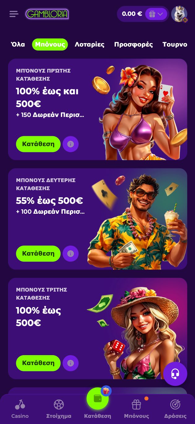 Εκτός των μπόνους για τις πρώτες τρεις καταθέσεις, στο Gambloria καζίνο θα βρείτε και πολλές ακόμα προσφορές, όπως βλέπετε στον παρακάτω πίνακα