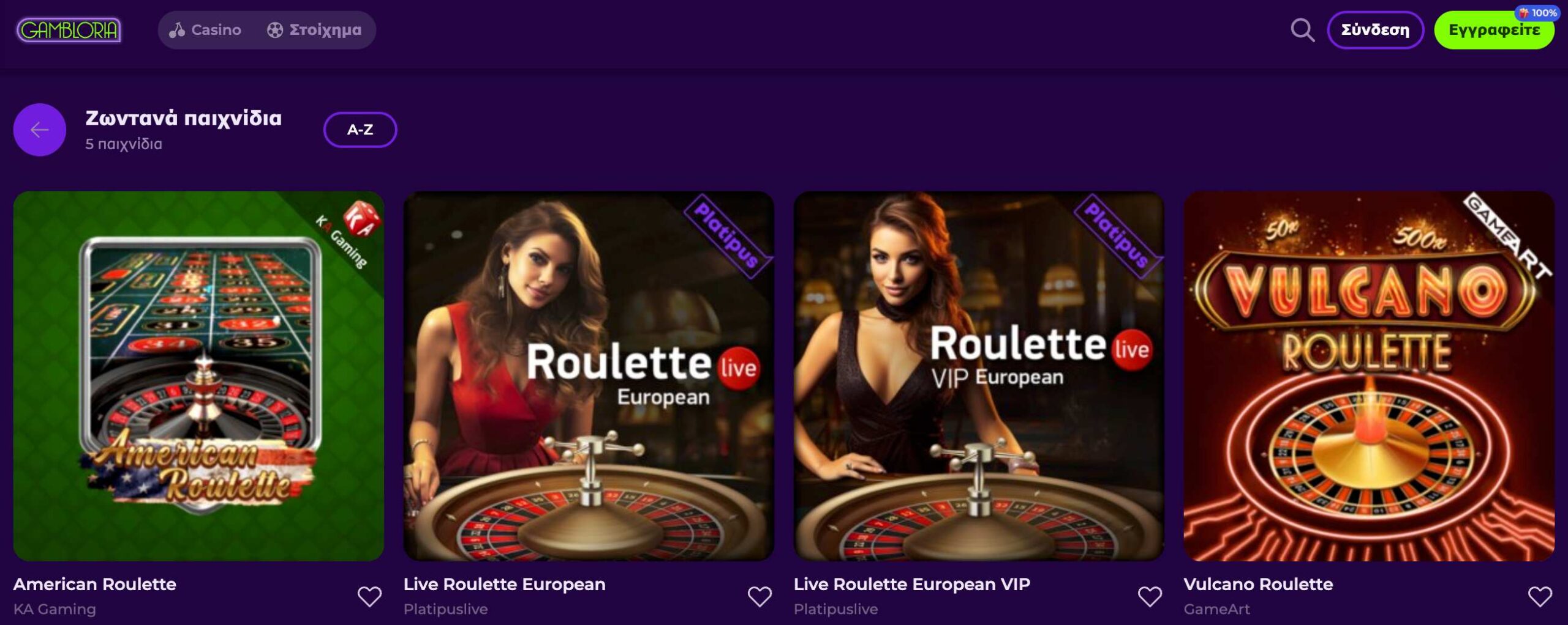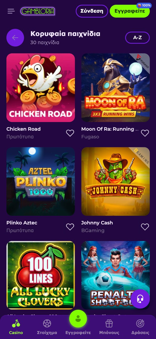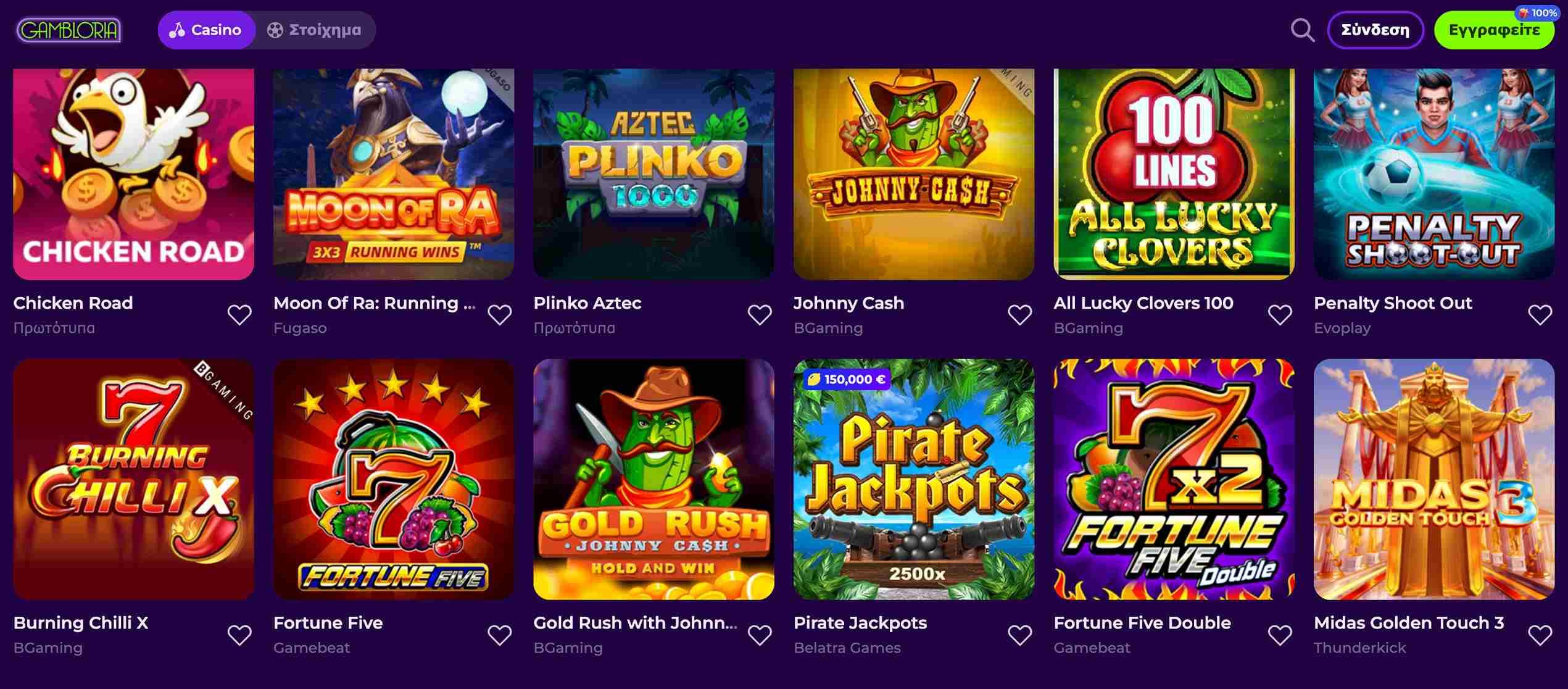 Περισσότερα από 3.000 παιχνίδια σας περιμένουν στο καζίνο Gambloria, με ένα μεγάλο μέρος αυτών να είναι από γνωστούς δημιουργούς όπως BGaming, ΚΑ Gaming, Belatra Games, Fugaso, Playson, Booming Games, GameArt, Gamebeat κλπ. Φυσικά θα βρείτε κι άλλους παρόχους, ανερχόμενους, όπως Felix Gaming, Platipus, Evoplay, Retro Games κ.α., όμως είναι αισθητή η απουσία κορυφαίων εταιριών όπως η Pragmatic Play, η Playtech και η Play’n GO.
