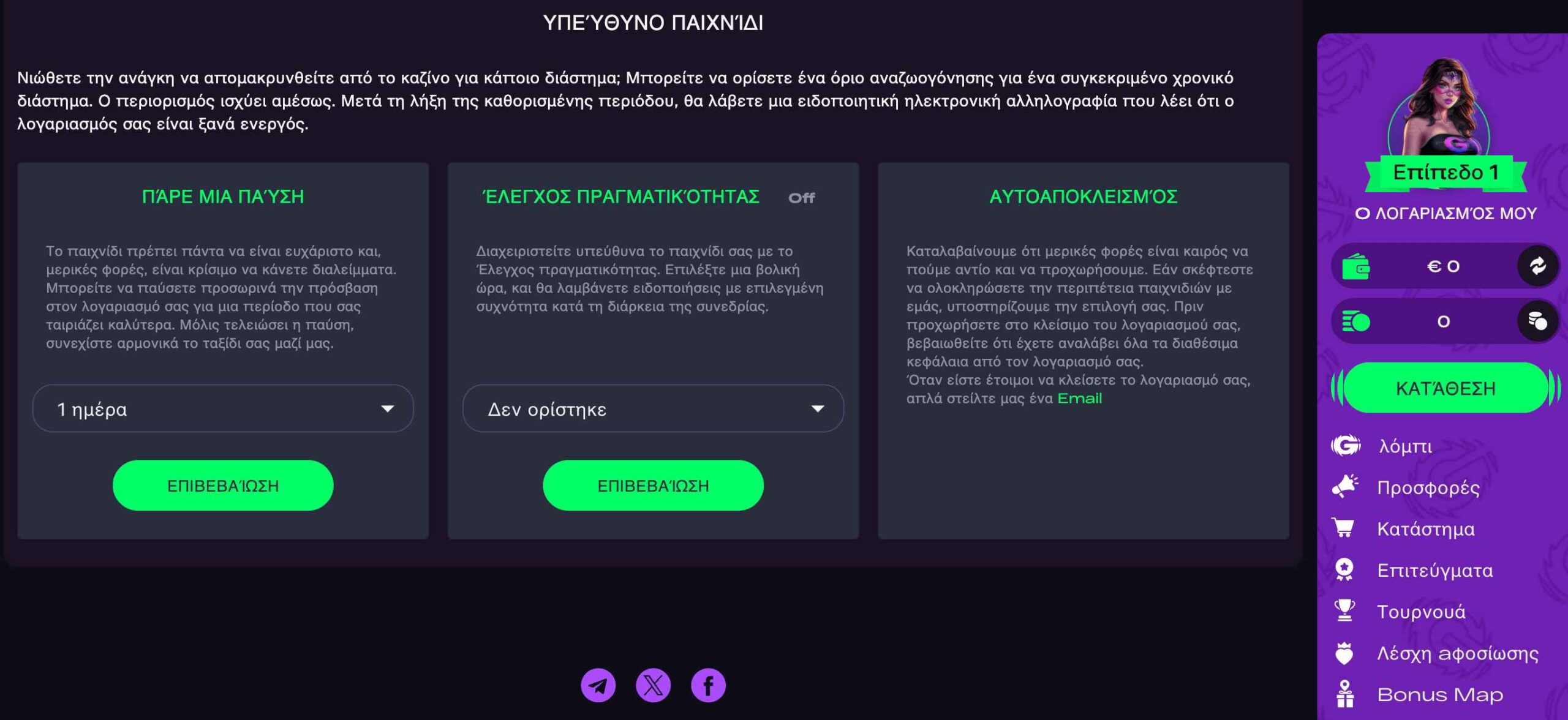 Αρχικά, υπάρχει η επιλογή “Take a break” που δίνει στους παίκτες τη δυνατότητα να απενεργοποιήσουν για ένα συγκεκριμένο χρονικό διάστημα (που ορίζουν οι ίδιοι) το λογαριασμό τους. Κατά τη διάρκεια του “break” δε μπορούν να κάνουν κατάθεση αλλά ούτε και να παίξουν παιχνίδια. Μόλις περάσει το διάστημα που έχει οριστεί για την παύση, ο λογαριασμός ενεργοποιείται και πάλι, επιτρέποντας στους παίκτες να κάνουν όλες τις δραστηριότητες κανονικά.