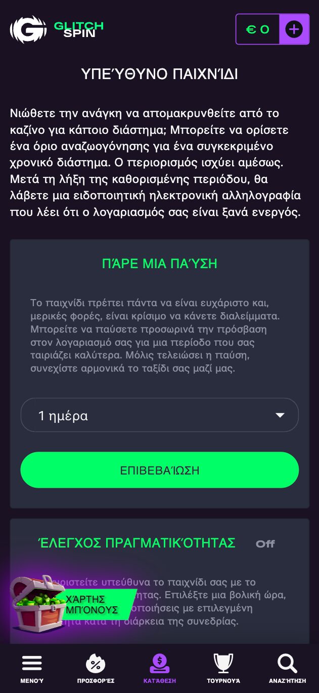 Το καζίνο Glitchspin έχει υιοθετήσει μια πολύ υπεύθυνη στάση απέναντι τους παίκτες λόγω του ρόλου που έχει ως πάροχος τυχερών παιχνιδιών. Εκτός από το ότι έχει μια ολόκληρη σελίδα αφιερωμένη στο να προωθεί τη σημασία του Υπεύθυνου Παιχνιδιού και να παρέχει και συμβουλές αλλά και links σε ειδικούς οργανισμούς που προσφέρουν στήριξη σε άτομα που αντιμετωπίζουν προβλήματα, το Glitchspin έχει και αρκετά εργαλεία που επιτρέπουν στους παίκτες να αποκτήσουν μεγαλύτερο έλεγχο στην παικτική τους δραστηριότητα.