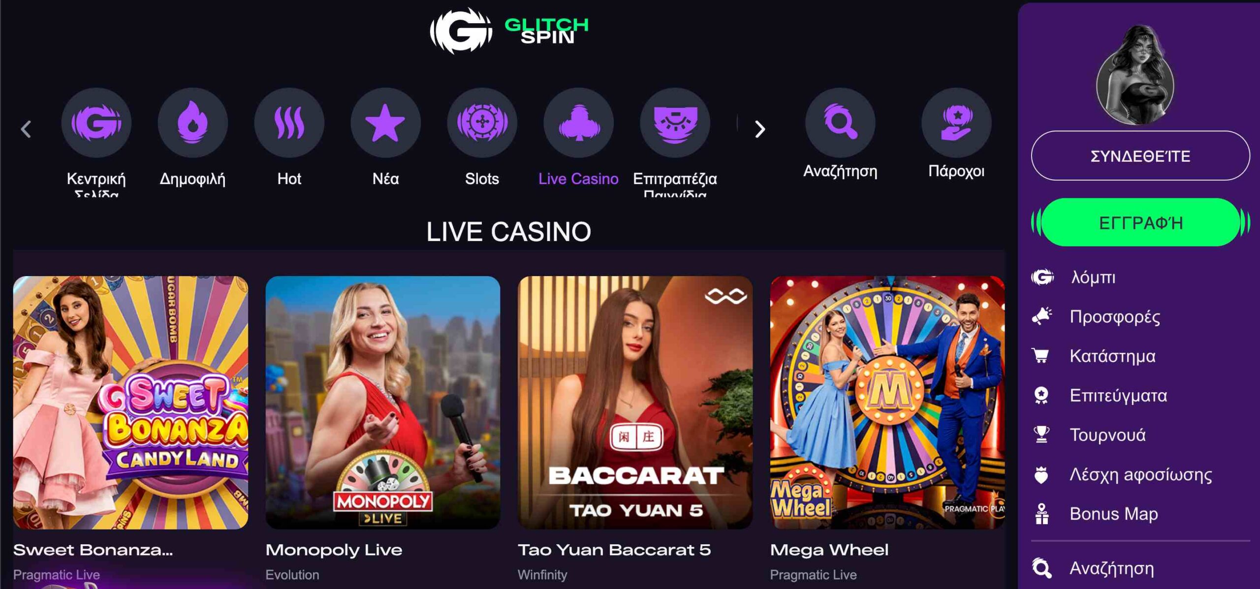 Τα Glitchspin έχει φρουτάκια, επιτραπέζια παιχνίδια, instant win games, λοταρίες και φυσικά live καζίνο.