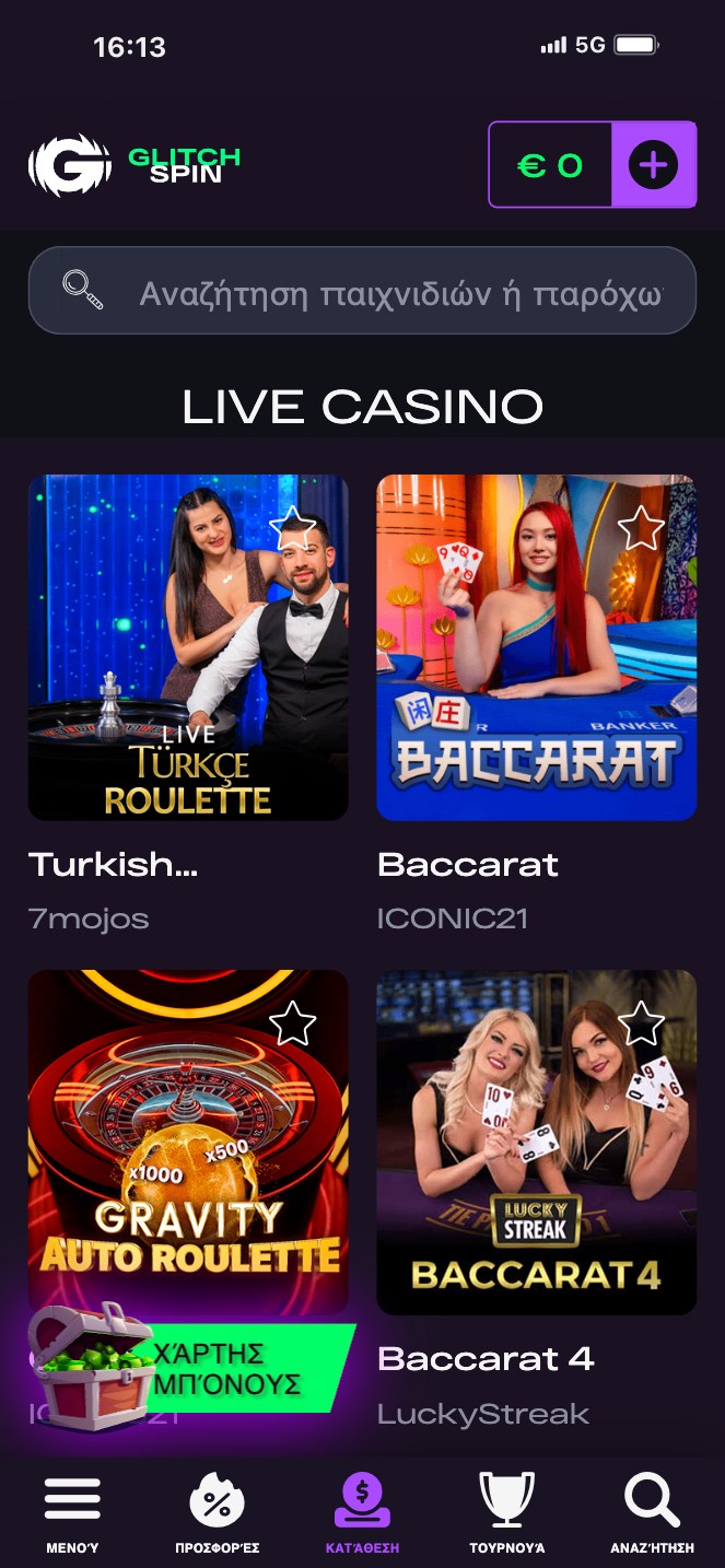 Όλα τα ζωντανά παιχνίδια θα τα βρείτε στην ξεχωριστή ενότητα Live Casino στην πλατφόρμα του Glitchspin. Έχετε αμέτρητες εναλλακτικές και εδώ και μάλιστα με την εγγύηση των μεγαλύτερων παρόχων λογισμικού: 7Mojos, Iconic21, Lucky Streak, Absolute Live Gaming, Playtech είναι μόνο μερικά από τα γνωστά ονόματα στο ζωντανό καζίνο.