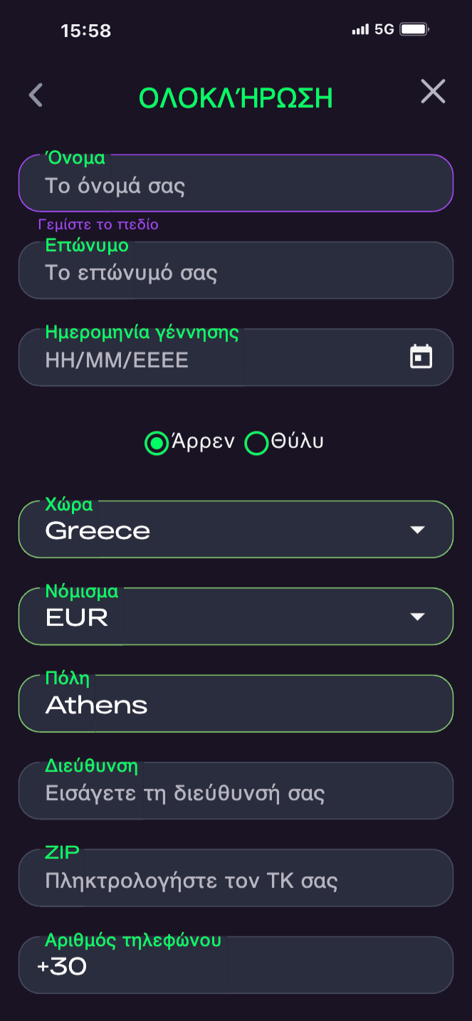 2ο βήμα: Εδώ βάζετε όλα τα προσωπικά σας στοιχεία (όνομα, επίθετο, ημερομηνία και έτος γέννησης, φύλο) και τα στοιχεία για την επικοινωνία με το καζίνο (διεύθυνση, ΤΚ, αριθμό τηλεφώνου). Πατάτε το κουμπί και ολοκληρώνετε την εγγραφή σας.