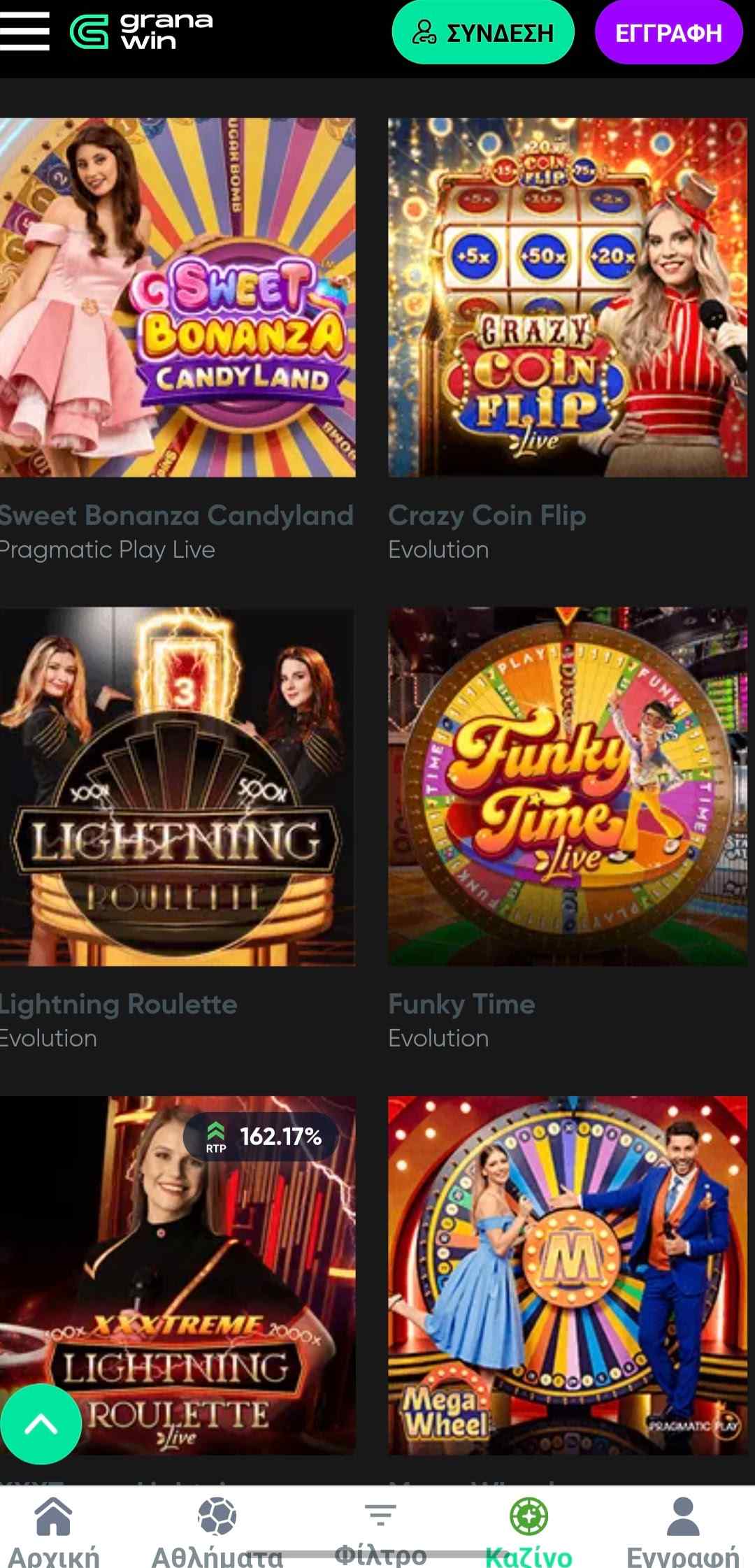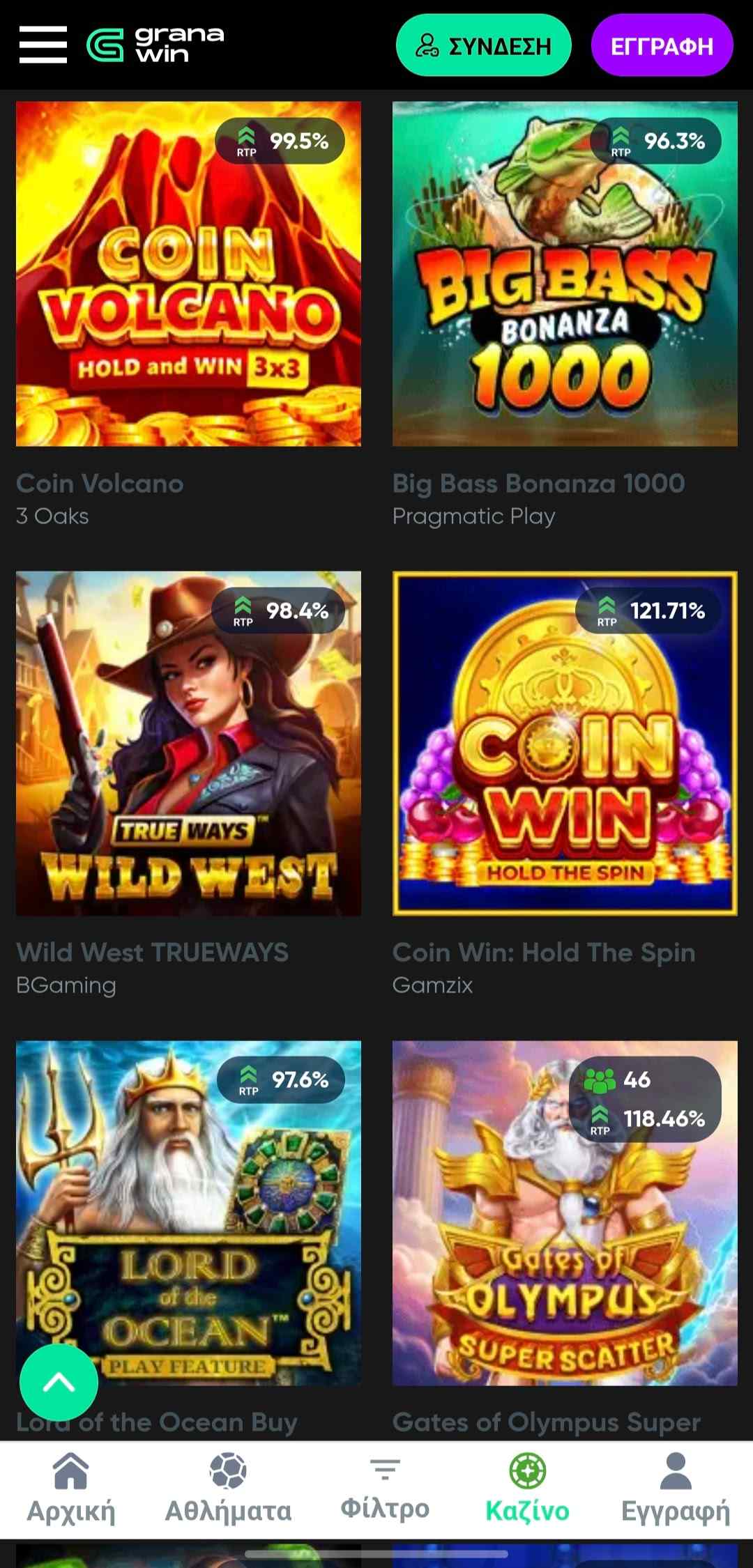 Συναντάμε ένα βασικό μενού, ώστε να δούμε τις κύριες κατηγορίες που σχετίζονται με το στοίχημα και το καζίνο, αλλά και τα μπόνους και λοιπές επιλογές. Έπειτα, υπάρχει επιμέρους φιλτράρισμα των παιχνιδιών για πιο στοχευμένο παιχνίδι. Ιδιαίτερα ενδιαφέρον είναι το γραφικό που μας ενημερώνει για το RTP στον εκάστοτε κουλοχέρη για το τελευταίο διάστημα, ώστε να παίξουμε βάση στρατηγικής.