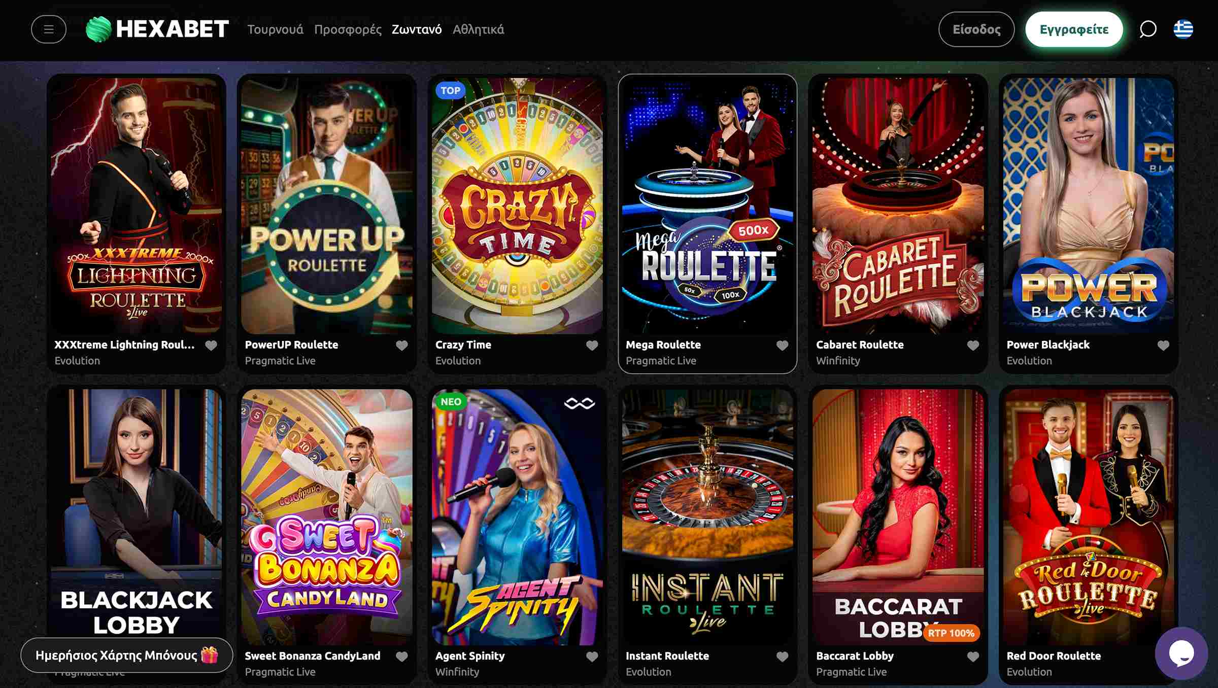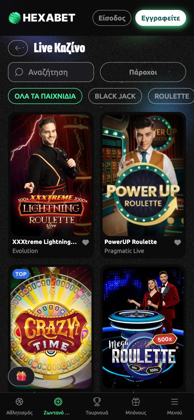 Εδώ είναι που θα ανακαλύψετε την απόλυτη πραγματική εμπειρία καζίνο με εκατοντάδες διαθέσιμες επιλογές, αμέτρητες επιλογές σε γνωστά τραπέζια και δεκάδες παραλλαγές. Το περιεχόμενο αποτελείται κυρίως από τα προϊόντα των Evolution και Pragmatic Play Live ενώ αισθητή είναι και η παρουσία λιγότερο δημοφιλών στούντιο όπως Ezugi, Creedroomz, BetGames και VivoGaming καθώς και μερικά ακόμη μικρότερα.