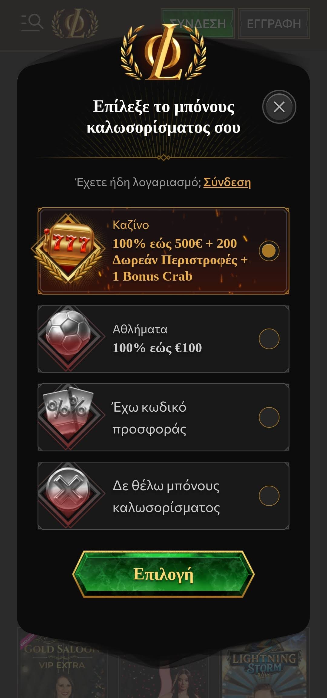 Αν αποφασίσετε να παίξετε στο καζίνο Legiano, σας περιμένουν πολλά μπόνους, πέρα από την προσφορά γνωριμίας που δίνεται σε όλους τους παίκτες που ανοίγουν λογαριασμό στο σάιτ. Για το καλωσόρισμα το καζίνο σας δίνει 100% της πρώτης κατάθεσης έως 500 ευρώ και 200 δωρεάν περιστροφές. Επίσης δίνει και 1 bonus crab σε όλους όσους κάνουν εγγραφή. Η μόνη προϋπόθεση είναι η πρώτη κατάθεση που θα γίνει να είναι τουλάχιστον 20 ευρώ, ενώ ο μοναδικός περιορισμός είναι η κατάθεση να μην γίνει με Skrill ή Neteller, γιατί δεν πληρούν τους όρους για το μπόνους.