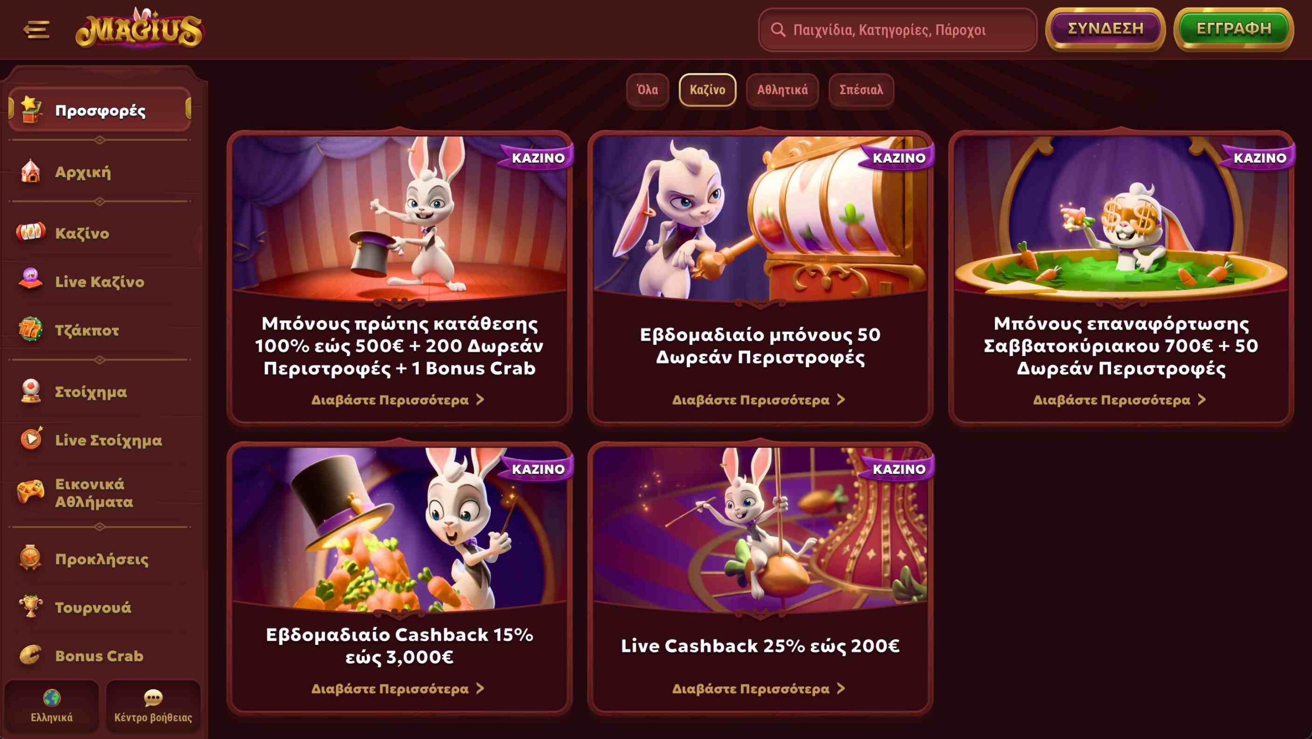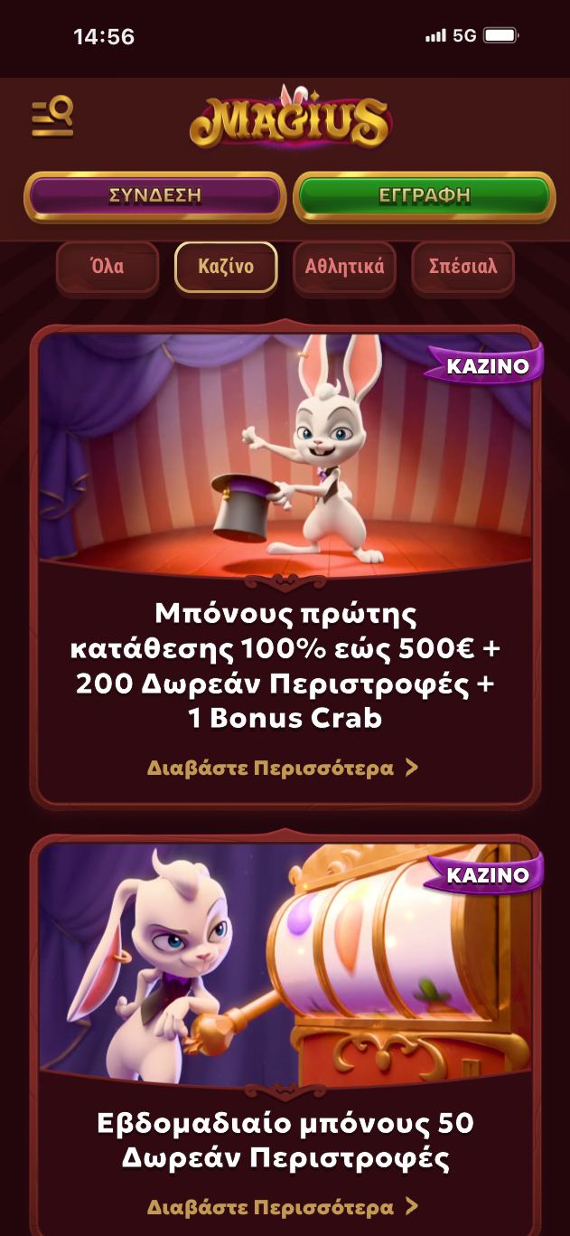 Στο καζίνο Magius ο σχεδιασμός προδιαθέτει τους παίκτες να απολαύσουν το παιχνίδι τους και να αφεθούν στο “μαγικό” κόσμο των τυχερών παιχνιδιών. Ένα κουνέλι -σήμα κατατεθέν της πλατφόρμας – κάνει ταχυδακτυλουργικά, μαγικά και σας καλεί να διεκδικήσετε μπόνους, έπαθλα και φυσικά κέρδη από τα χιλιάδες παιχνίδια που προσφέρονται στον ιστότοπο.