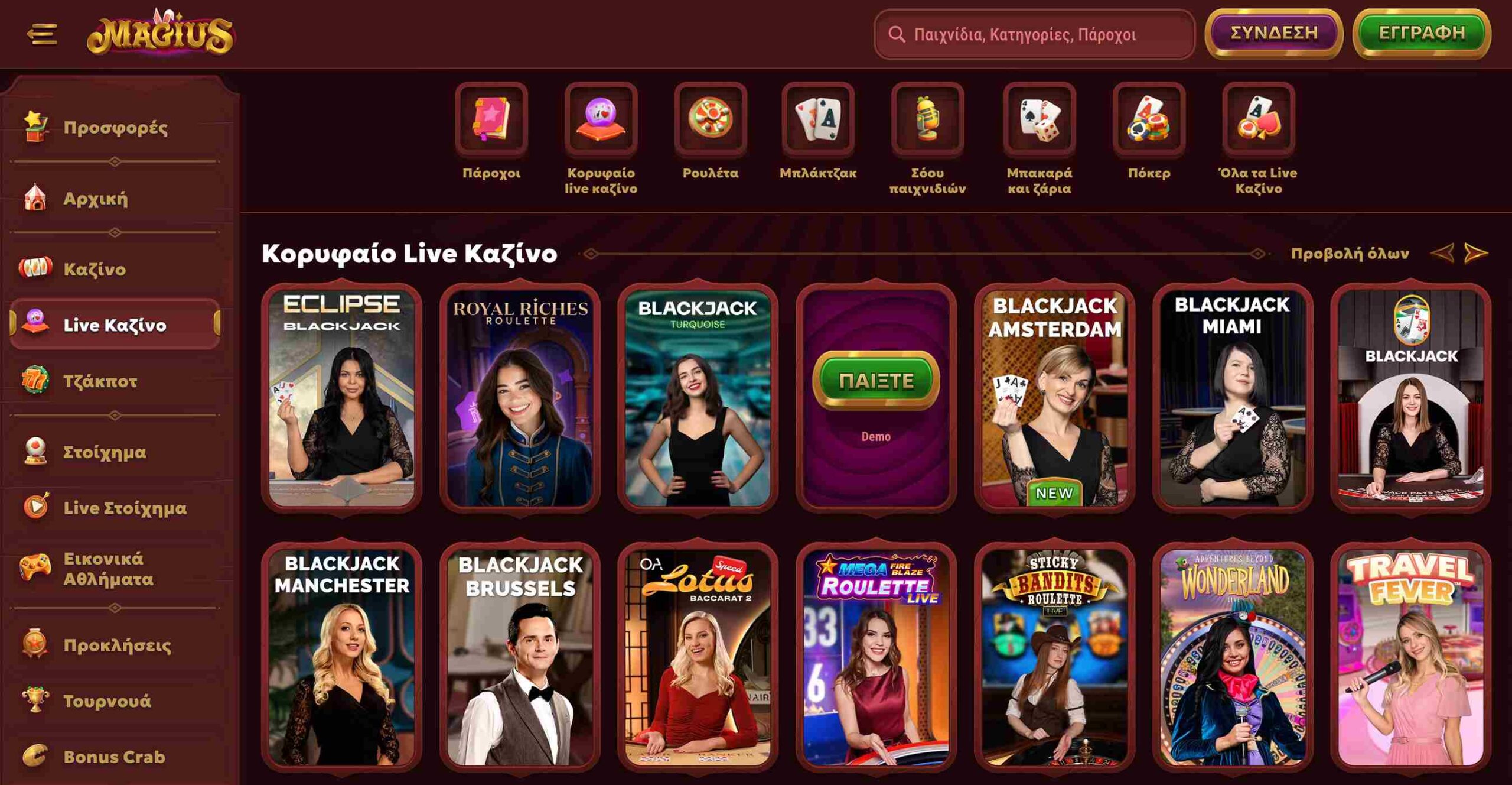 Για το live casino, το Magius συνεργάζεται με τους κορυφαίους παρόχους – όπως και για τα υπόλοιπα παιχνίδια. Οι εταιρίες που σας προσφέρουν τις αίθουσες με τους πραγματικούς ντίλερ είναι: OnAir, Playtech, BetGames, Stakelogic, Real Dealer Studies, Bombay Live, Lucky Streak μεταξύ άλλων.