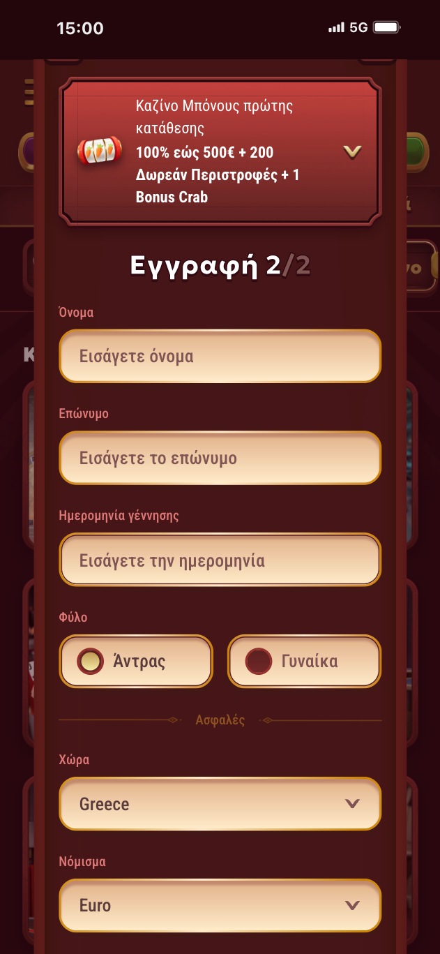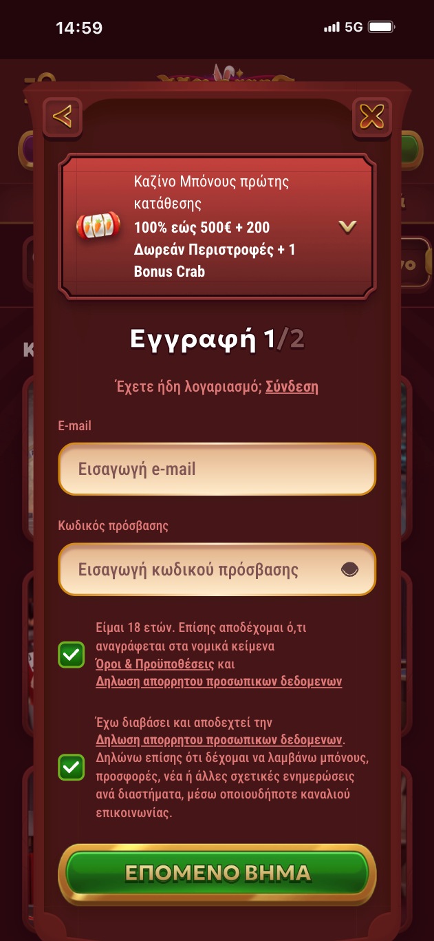 Το μπόνους εγγραφής είναι μια προσφορά που δίνεται στην πρώτη κατάθεση που θα κάνει ο νέος παίκτης. Με την κατάθεση του, παίρνει μπόνους 100% έως τα πρώτα 500€, 200 free spins αλλά και ένα bonus crab! Αν αποφασίσει να το διεκδικήσει αυτό το μπόνους ένας νέος χρήστης στην πλατφόρμα θα πρέπει να βεβαιωθεί πως η κατάθεση του πληροί τις παρακάτω προϋποθέσεις.