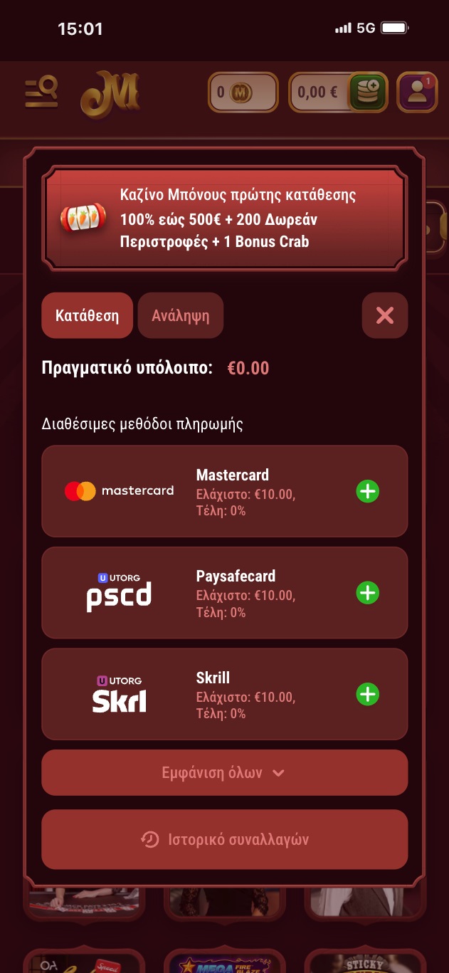 Για τις καταθέσεις έχετε την επιλογή ανάμεσα σε Mastercard, Paysafecard, eWallets (Skrill, Neteller και MiFINITY) καθώς και κρυπτονομίσματα (Bitcoin, Litecoin, USDT και Dogecoin). Συνολικά δηλαδή εννέα εναλλακτικές για να διαλέξετε.