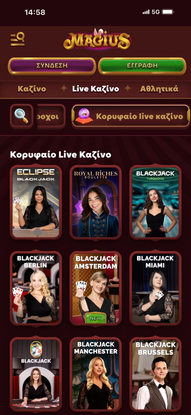 Ζωντανά παιχνίδια: τα ζωντανά παιχνίδια είναι στα ατού του Magius, αφού προσφέρει μια αρκετά μεγάλη ποικιλία σε πόκερ, μπακαρά και ζάρια, ρουλέτα, blackjack, γνωστά τηλεπαιχνίδια προσαρμοσμένα στο καζίνο και όλα αυτά με την εγγύηση μεγάλων παρόχων λογισμικού live τραπεζιών με πραγματικό ντίλερ και πραγματικούς αντιπάλους.