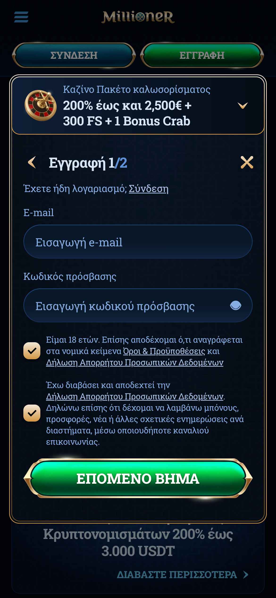 | 💶 Μέθοδοι πληρωμών | Visa, Mastercard, Skrill, Neteller, Paysafecard, Τραπεζικό Έμβασμα, MiFinity, Tether, Bitcoin, Ethereum, Litecoin, Ripple, USDC, Bitcoin Cash, Cardano |