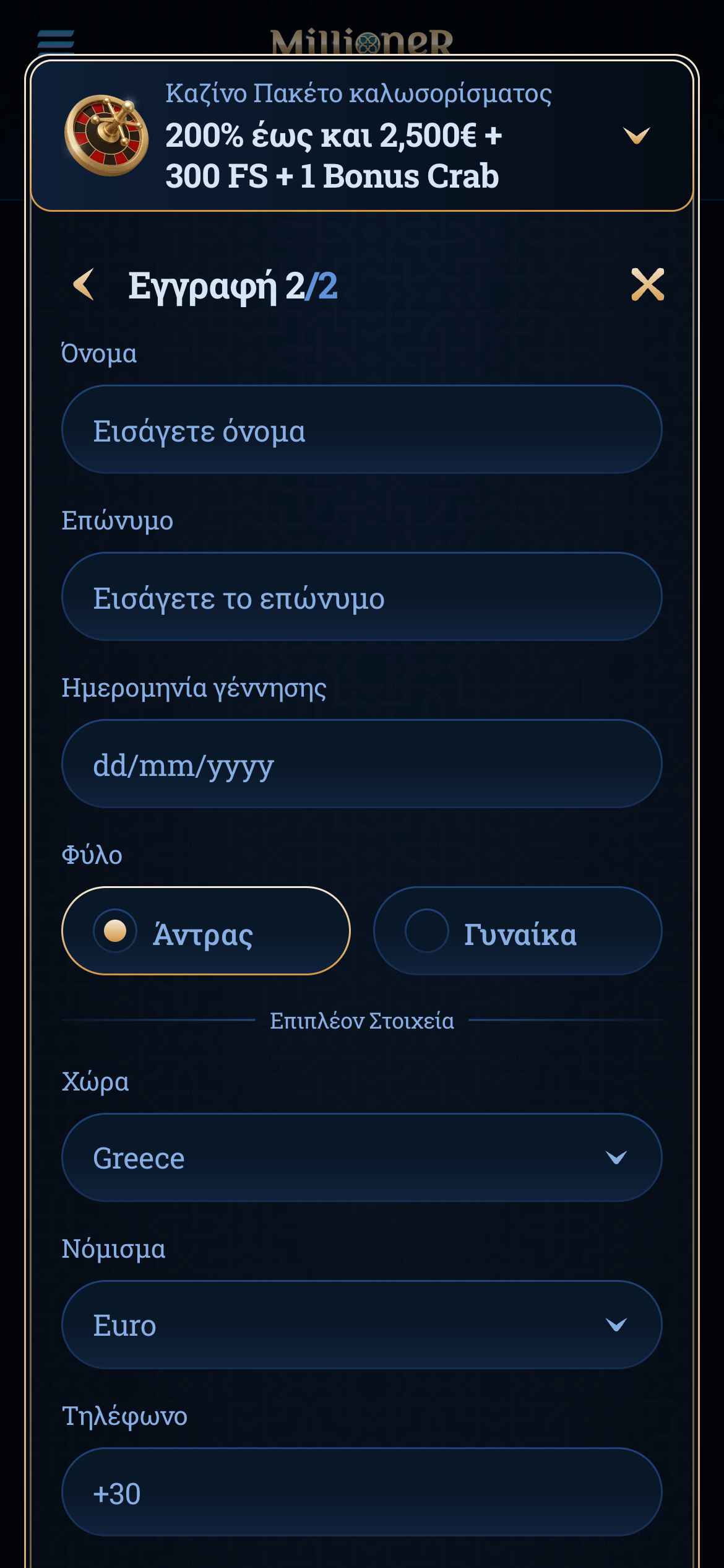 Προκειμένου να μπορέσετε να αξιοποιήσετε όλα τα εργαλεία του Millioner και να παίξετε βεβαίως με πραγματικά χρήματα, θα πρέπει πρώτα να έχετε έναν προσωπικό λογαριασμό στο online casino. Η διαδικασία για τη δημιουργία του προφίλ σας στη σελίδα έχει ως εξής: