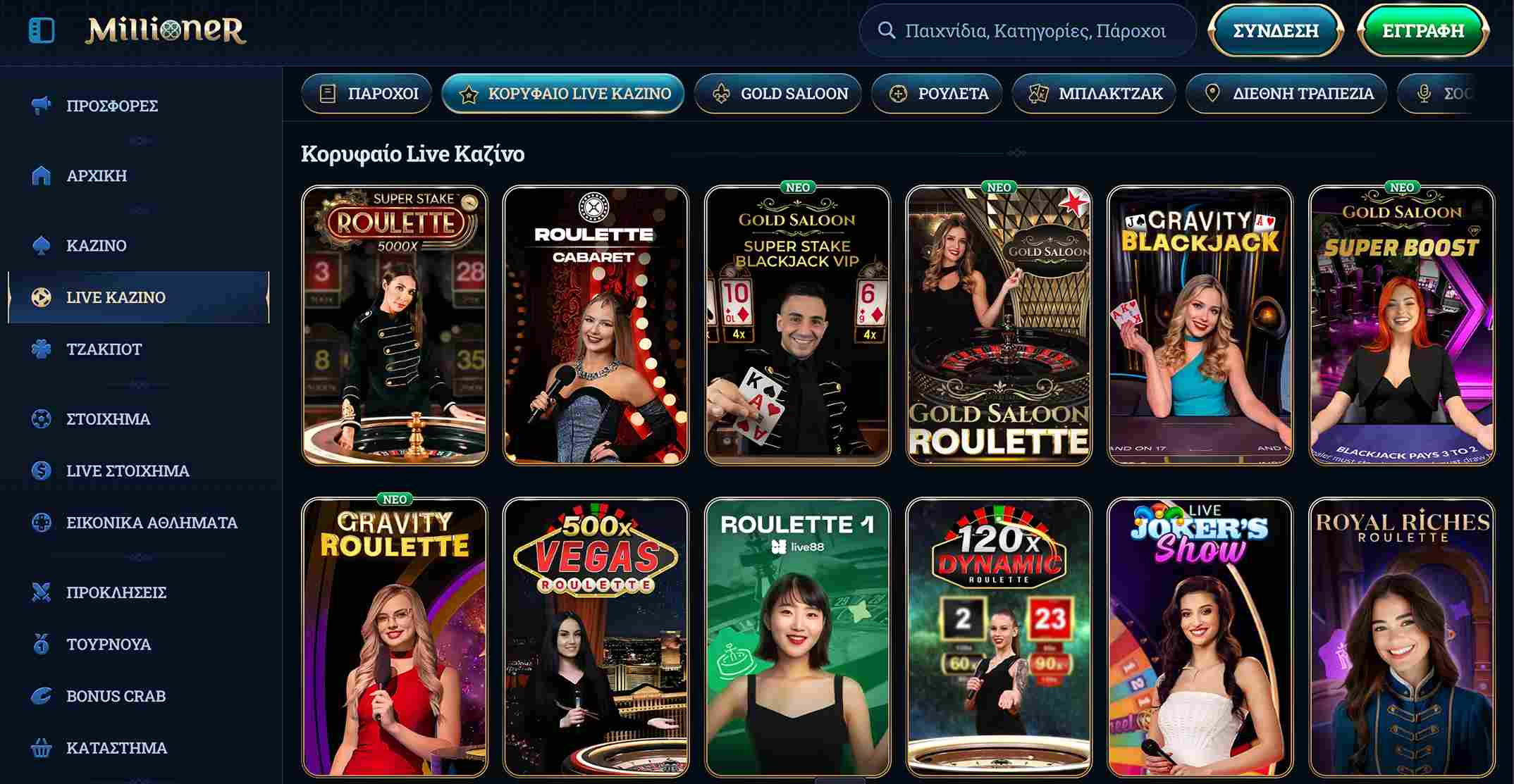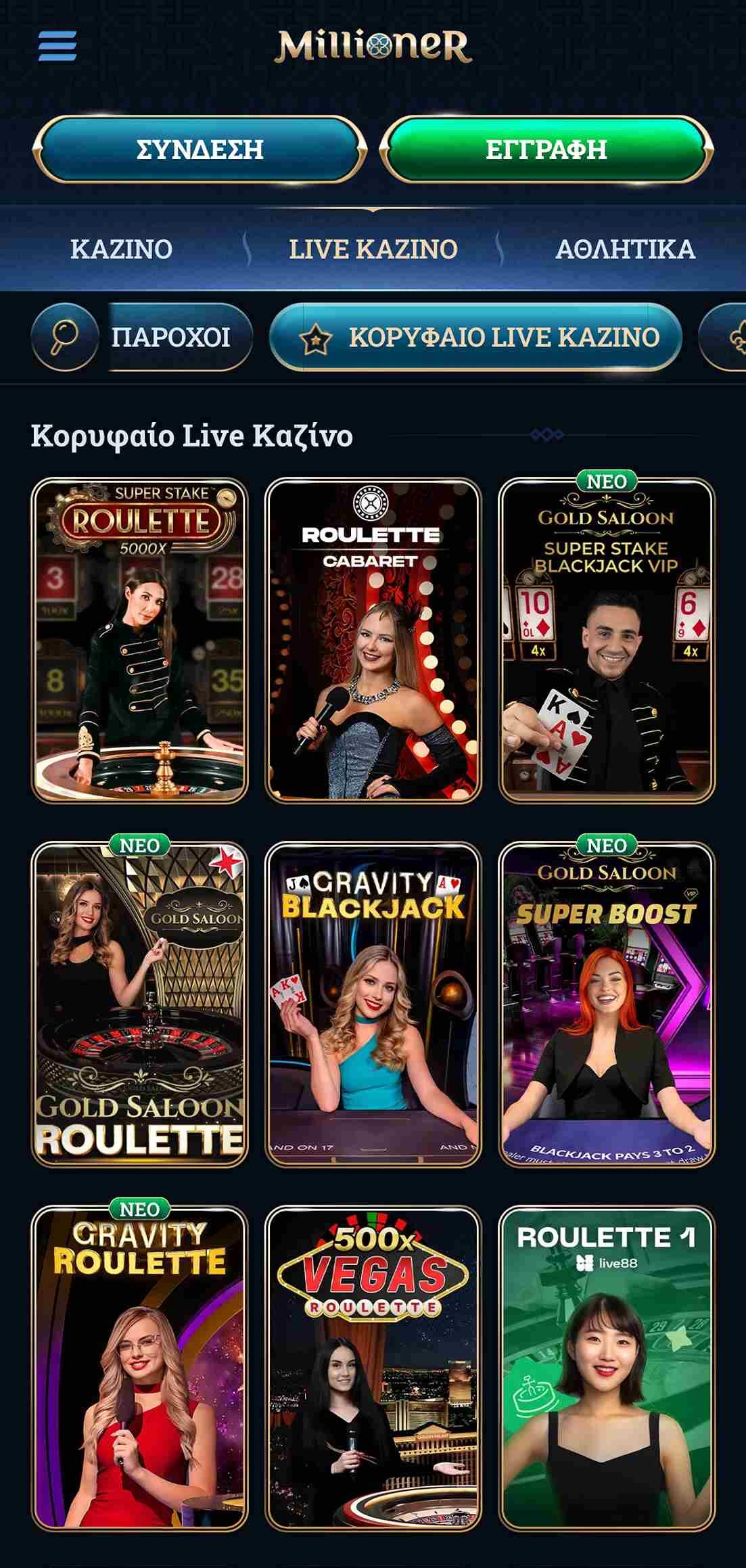 Η ενότητα live casino του Millioner φιλοξενεί πληθώρα από τραπέζια με πραγματικούς κρουπιέδες. Μπορείτε να βρείτε το ζωντανό καζίνο σε ξεχωριστή καρτέλα και σχετικά κουμπιά για να φιλτράρετε τα διάφορα παιχνίδια.